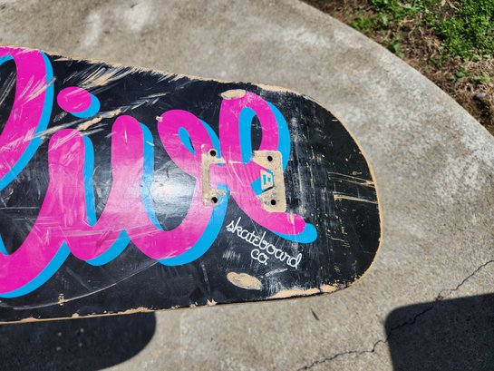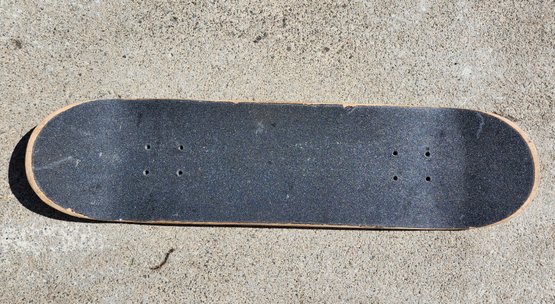 Notes: The deck shows visible signs of use including scratches to the underside graphic and wear on the grip tape, but remains structurally sound; comes as shown, sold as is.