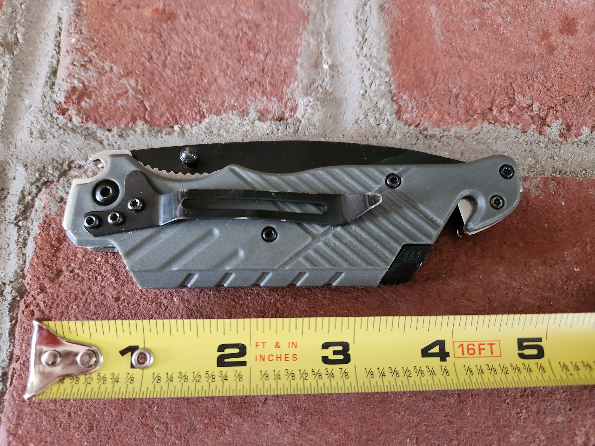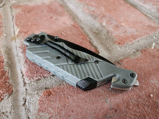 This tactical rescue knife features a durable gray textured handle and a black-finished blade designed for versatile utility. The integrated seatbelt cutter and window breaker pommel provide essential emergency functions in a lightweight, pocket-ready design.