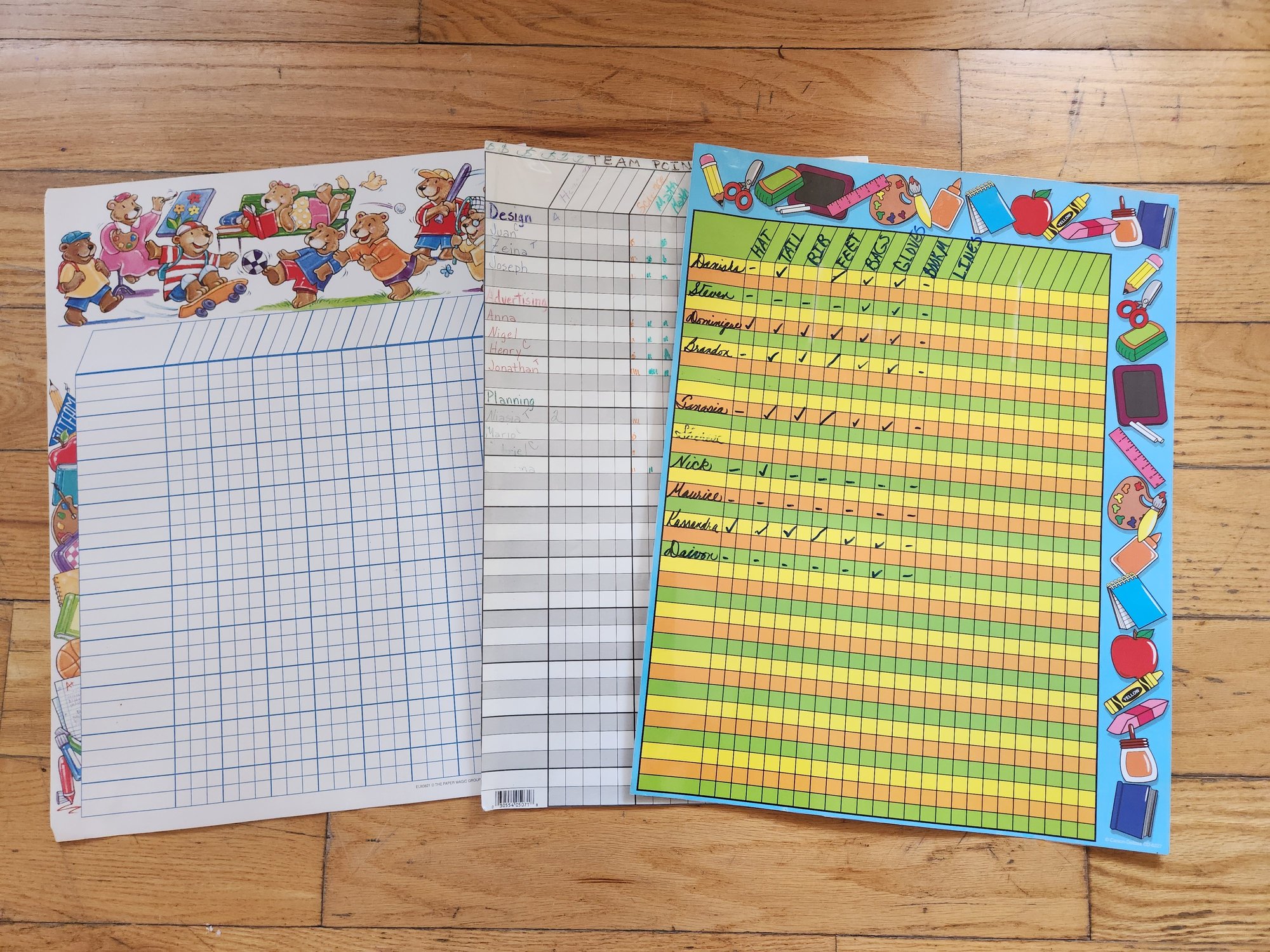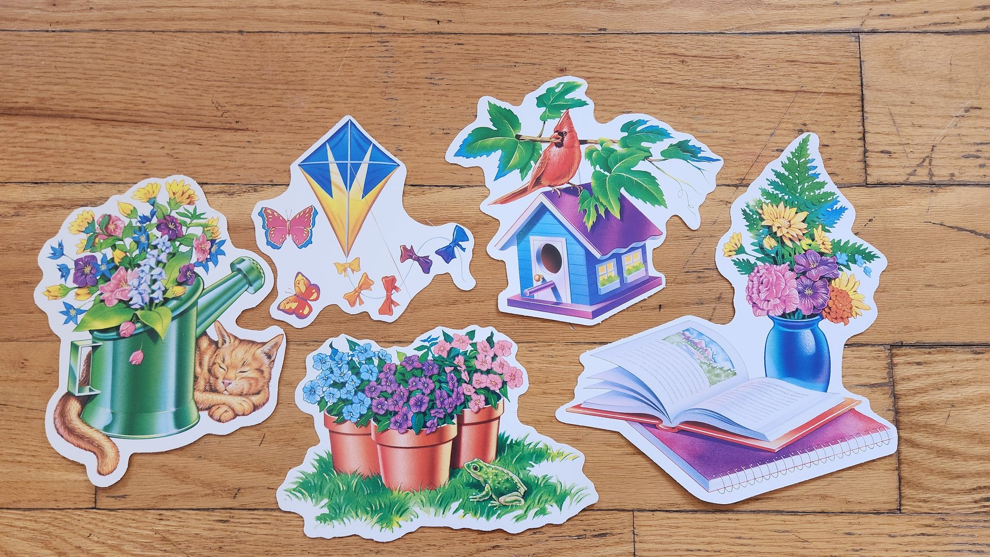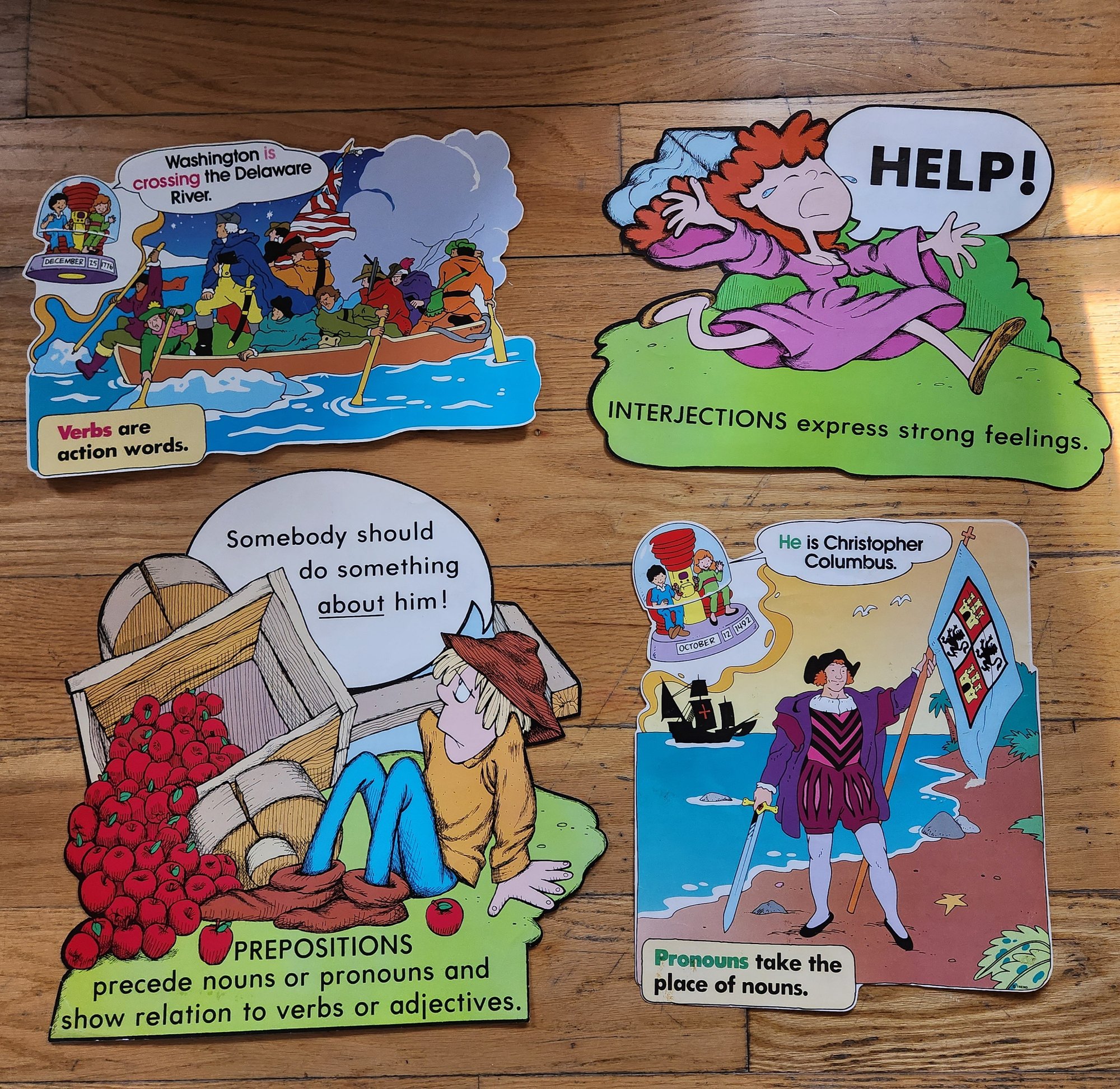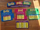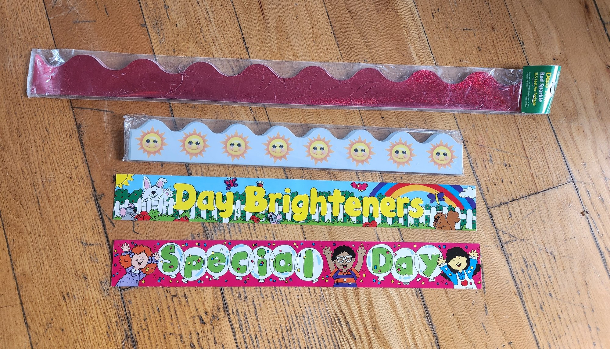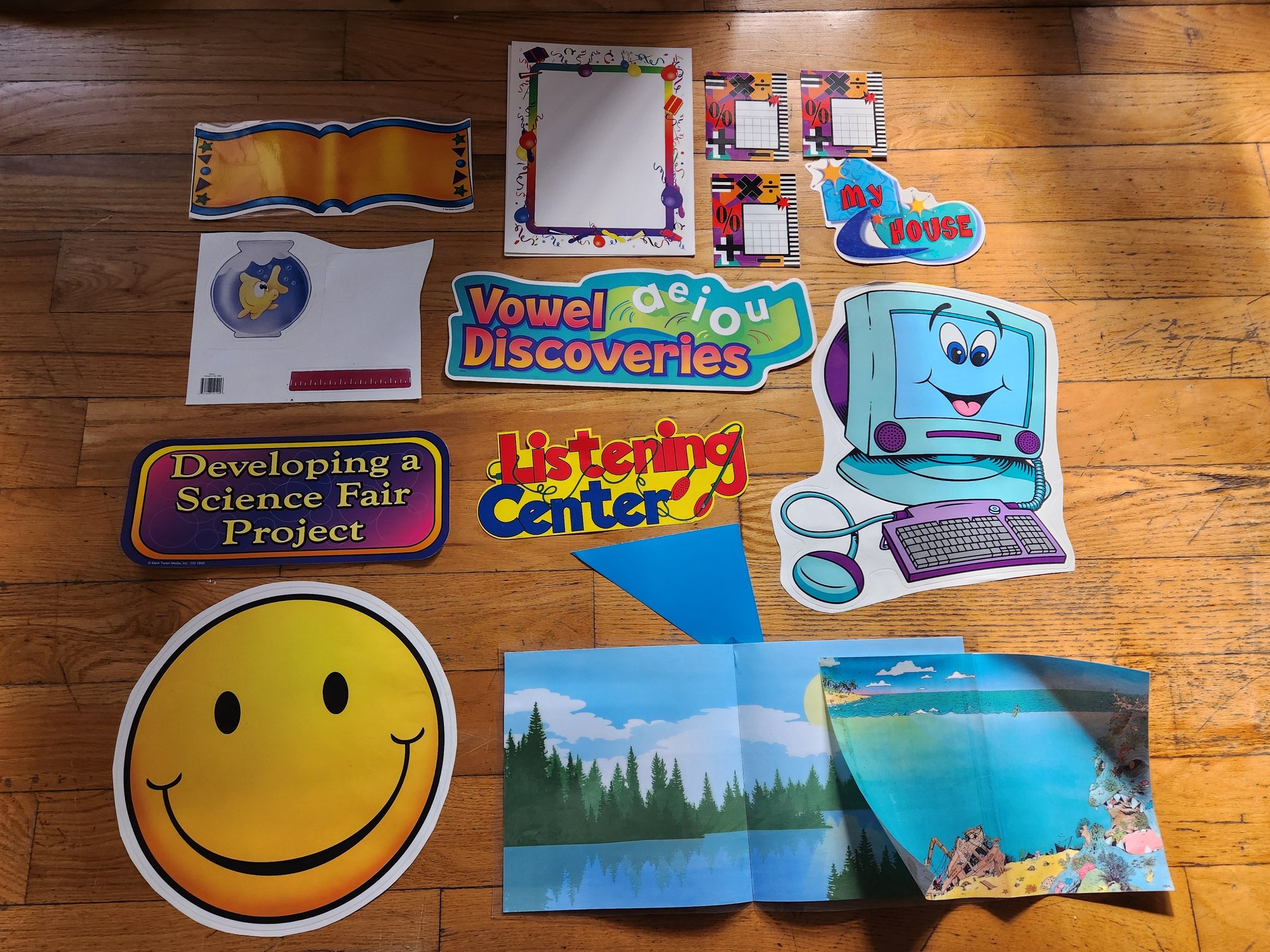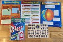 This lot features a professional-grade setup for educators, specializing in large-scale classroom organization. It includes a Made in USA Herff Jones desktop globe and two blue canvas chart carriers designed for "big books" and teaching aids. Rounding out the collection is a significant archive of vintage classroom bulletin board sets, featuring out-of-print thematic designs from the 1990s.