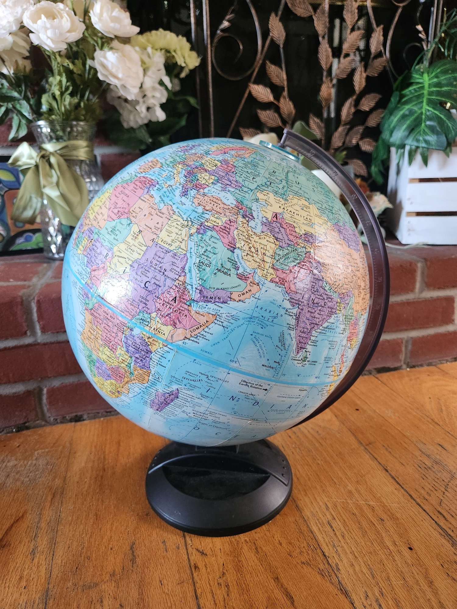 Notes: The globe features a stable base and smooth rotation. The canvas carriers are robust with all zippers and straps fully intact. The vintage paper goods are well-preserved with vibrant colors and clean edges. This item comes as shown, sold as is.