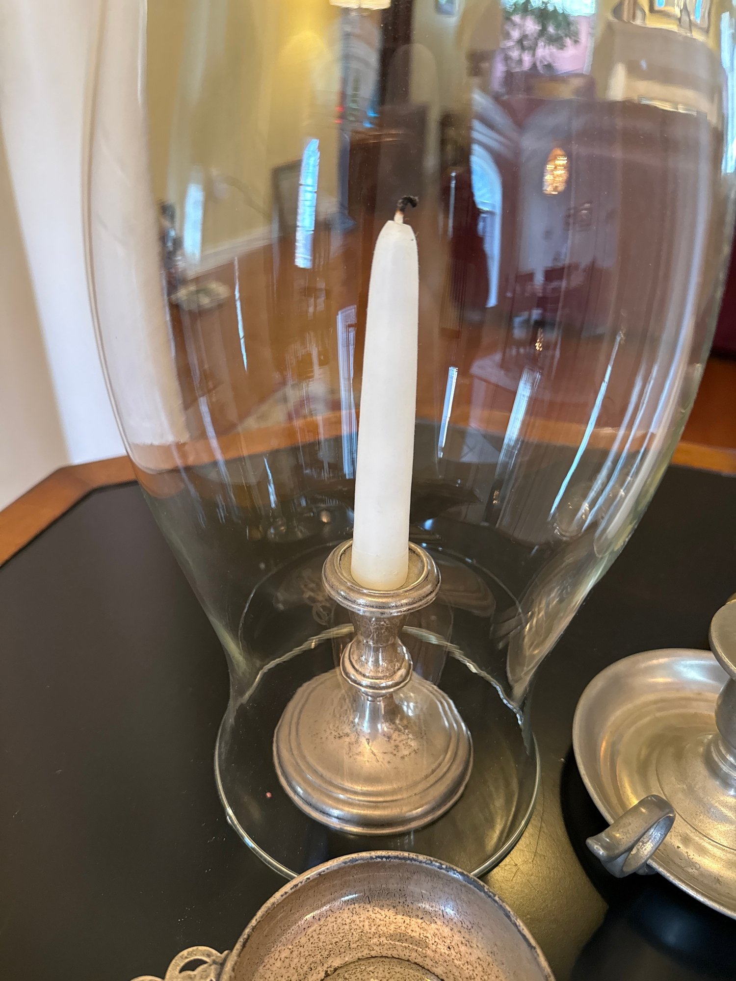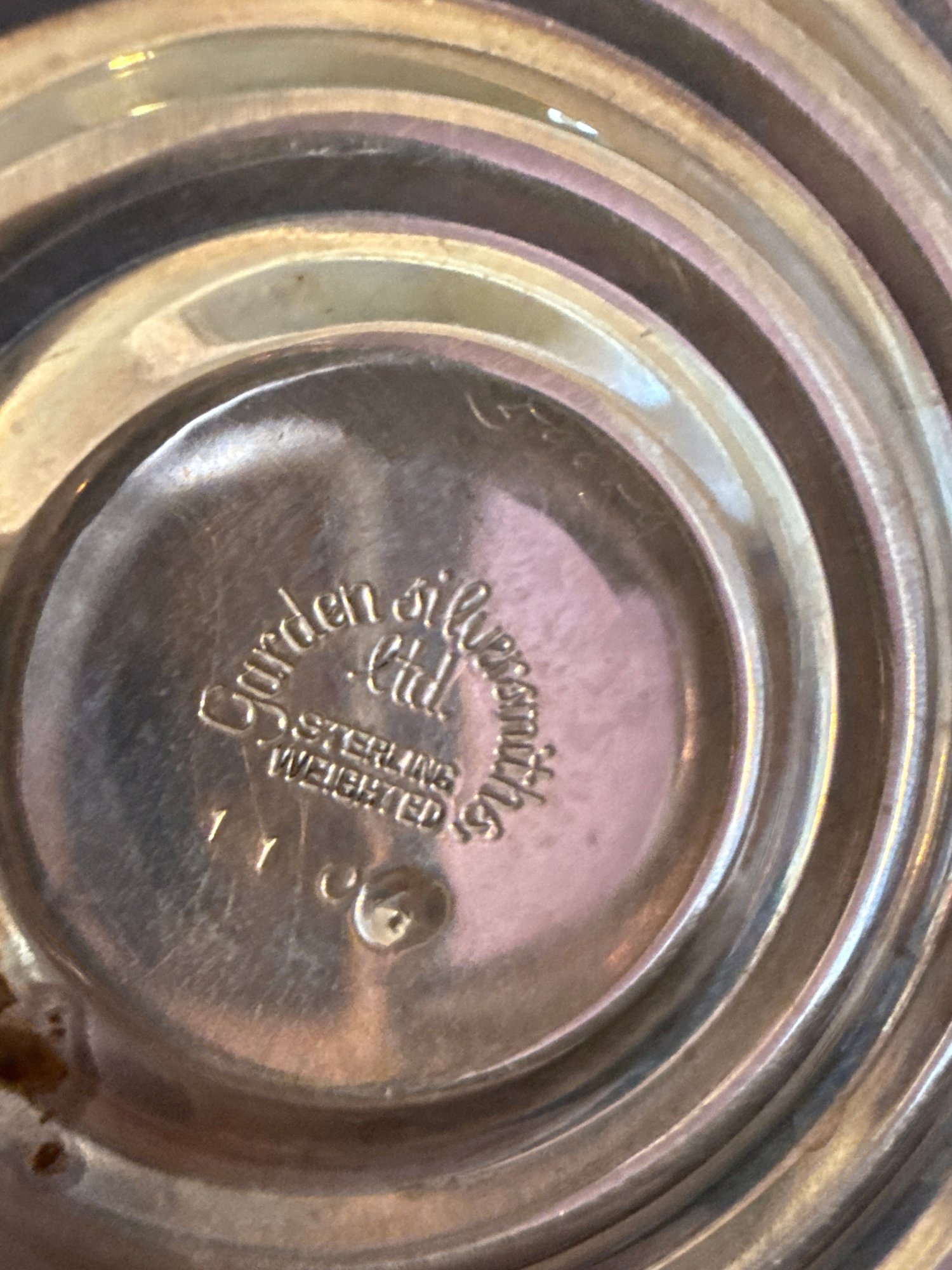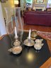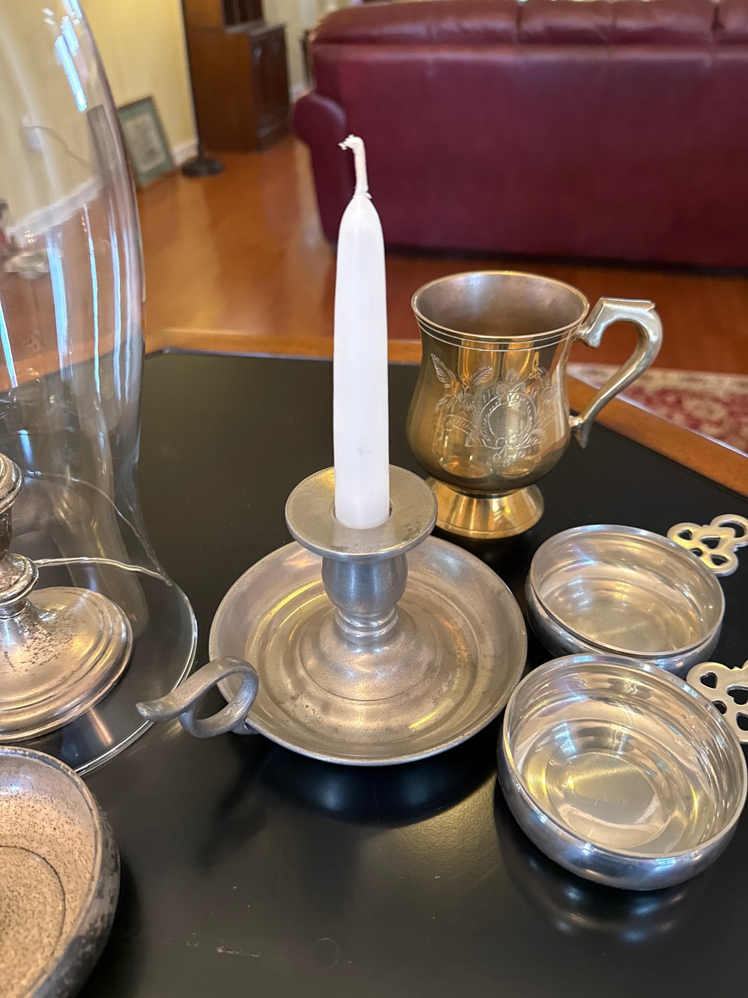 Includes the Steiff pewter bowls, sterling candlestick with hurricane, sterling bowl and brass cup.