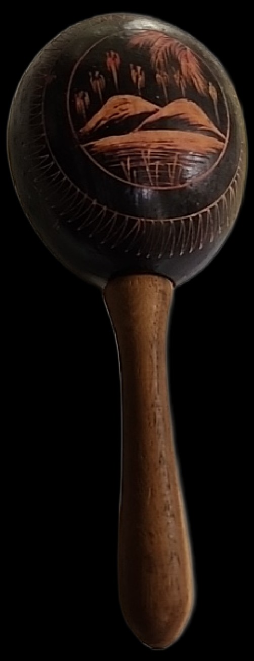 Maracas are traditional Latin American percussion instruments with roots in indigenous Caribbean and South American cultures, dating back centuries. They became popular tourist souvenirs and musical instruments throughout the mid-20th century, particularly from Cuba, Mexico, and other Latin American countries. Hand-carved and painted maracas like this one were commonly produced from the 1940s through the 1970s as both functional instruments and decorative keepsakes. These items appeal to collectors of vintage musical instruments, Latin American folk art enthusiasts, and those interested in mid-century tourist memorabilia. The hand-painted tropical scenes and natural materials make each piece unique, representing traditional craftsmanship and cultural heritage that resonates with collectors of folk art and world music instruments.