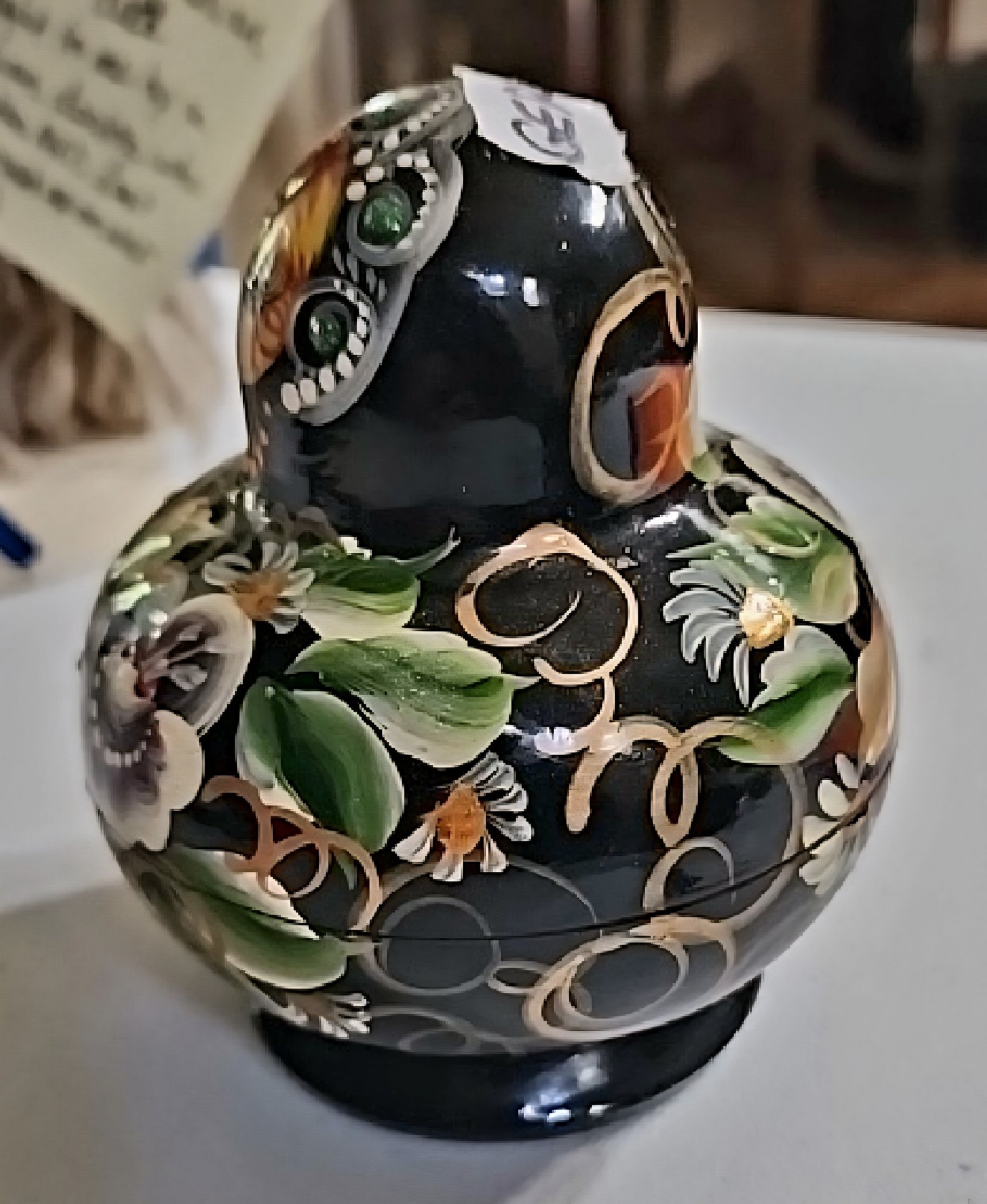 This nesting doll represents the iconic Russian matryoshka tradition, which originated in the late 19th century and became a symbol of Russian folk art. The black lacquer base with hand-painted floral designs reflects the influence of traditional Russian lacquer miniature painting from villages like Palekh and Fedoskino. These decorative nesting dolls were produced throughout the 20th century as both souvenirs and collectible art pieces, showcasing the intricate craftsmanship of Russian artisans.