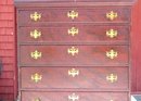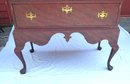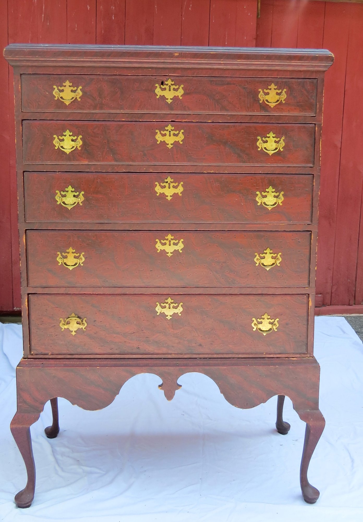 Paint decorated 5 drawer chest on frame, case 39” w x 19” d. base has bandy leg with duck foot, acorn drop in center skirt, base been restored with old wood, hardware replaced