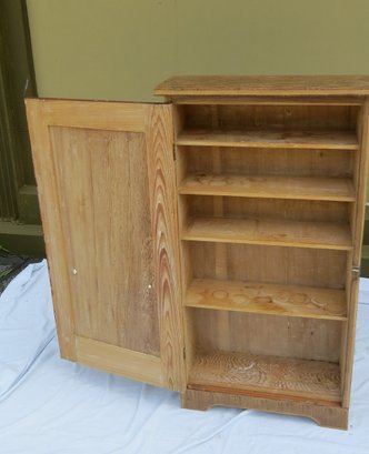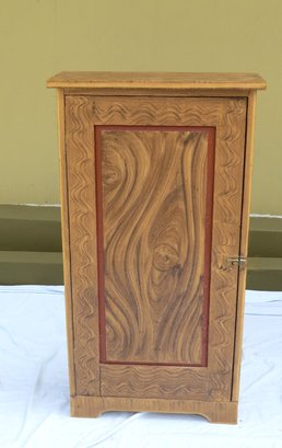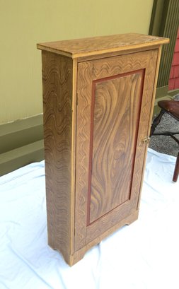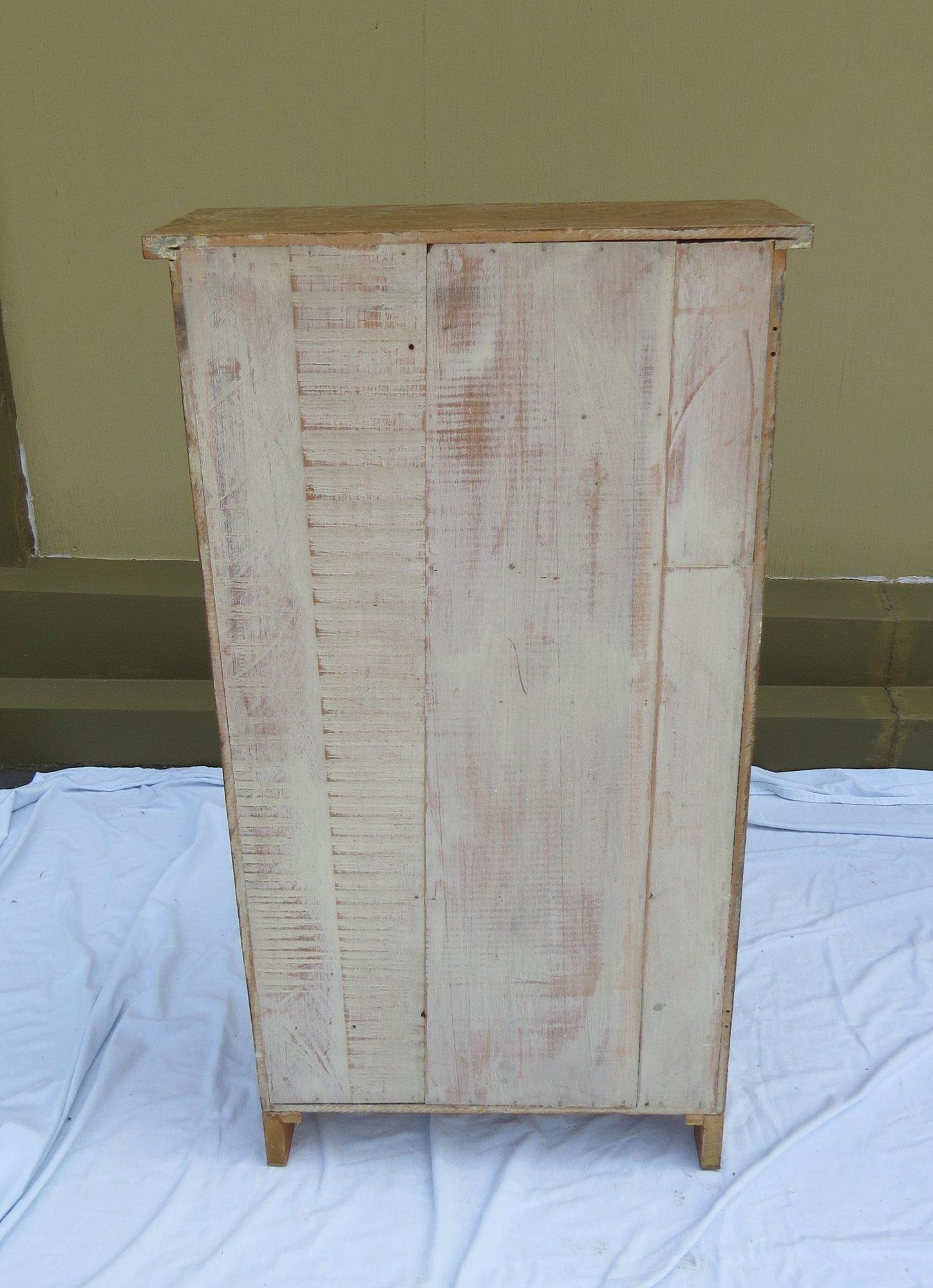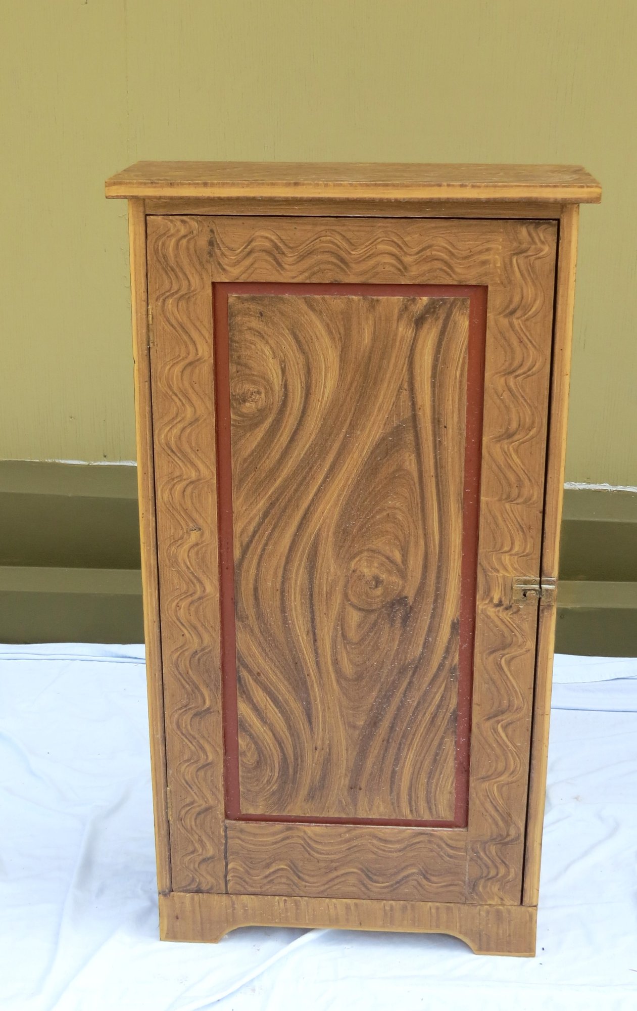 Paint decorated floor cabinet with raised panel door stands on cut out base, 39” h. x 21`” w. x 8” deep