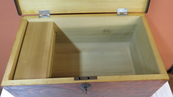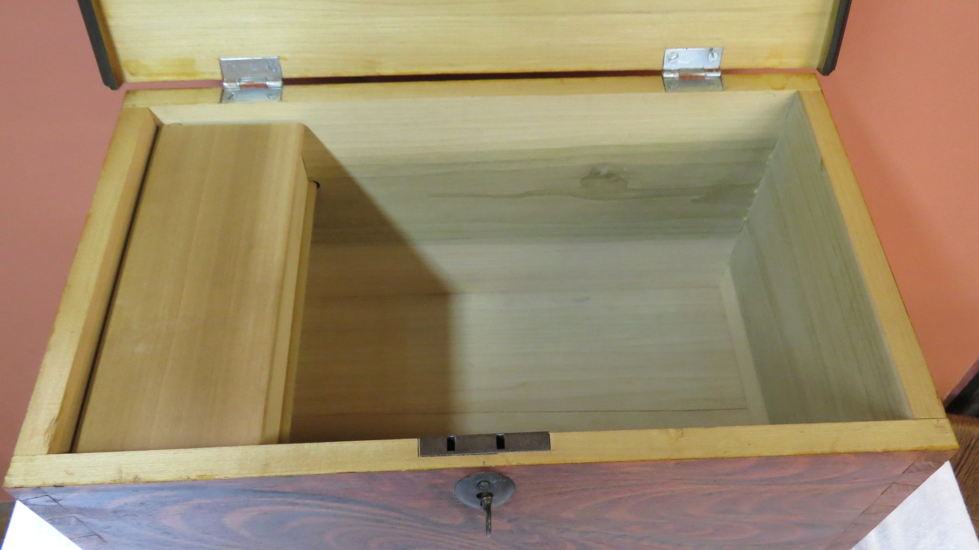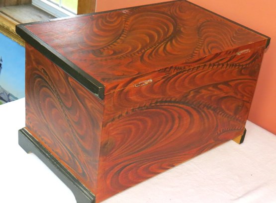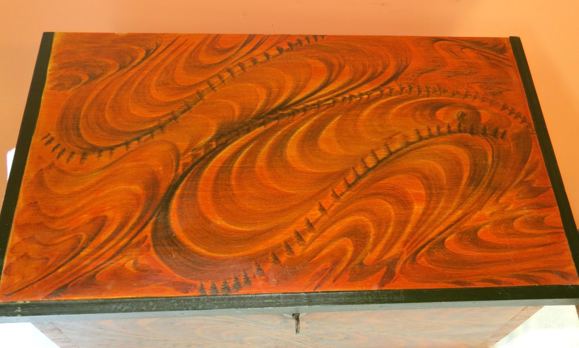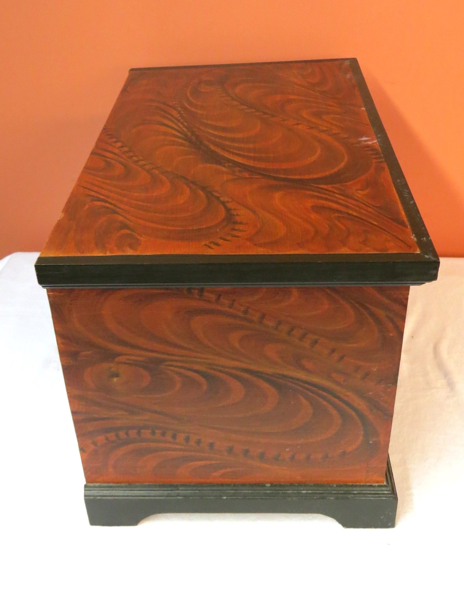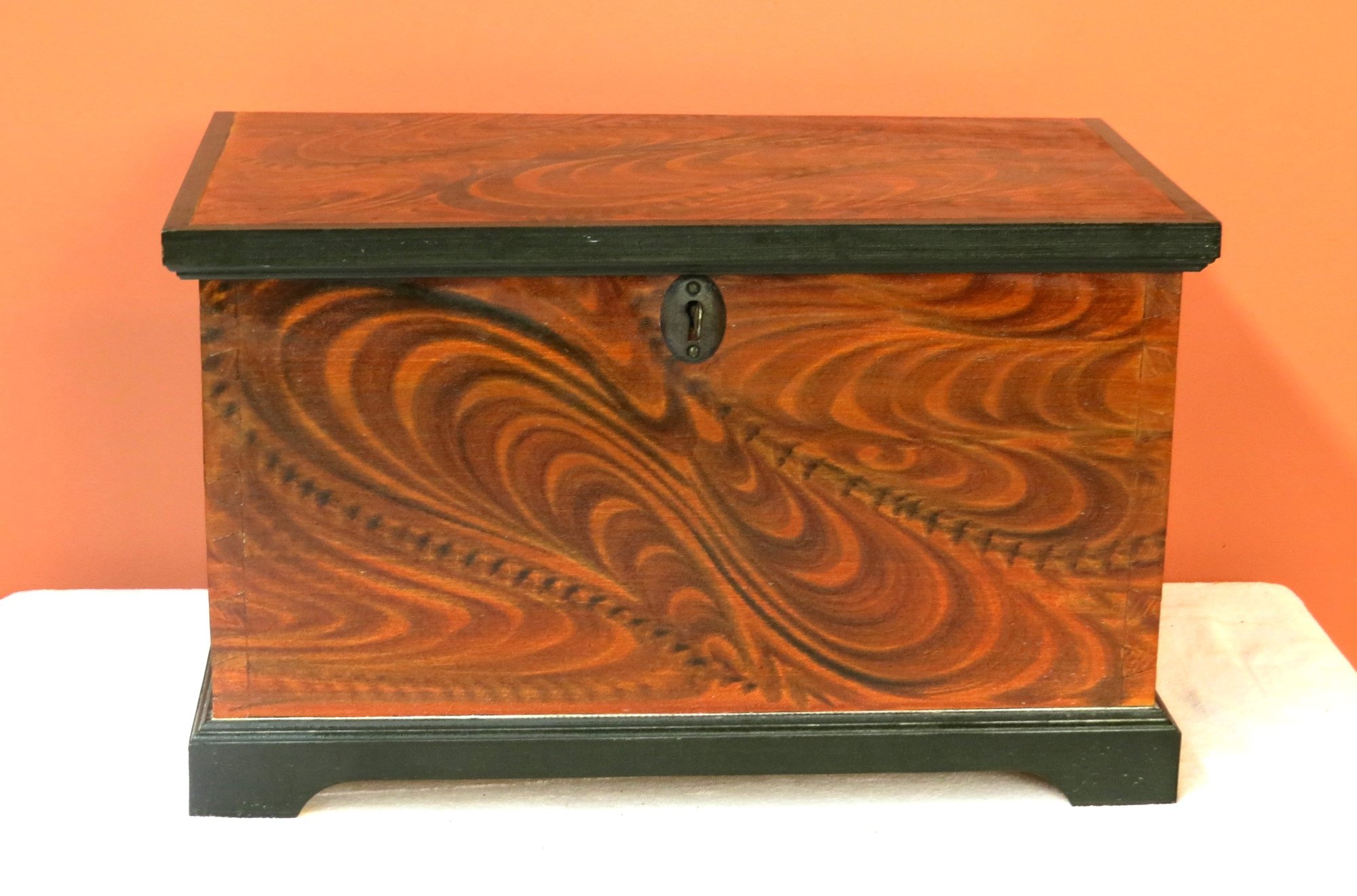 Paint decorated miniature chest made by C. J. Hopf Kennebunk ME, has lock, key and till, 19” w. x 11 ¼” d. x 11 ¼” d. x 11 ½” h