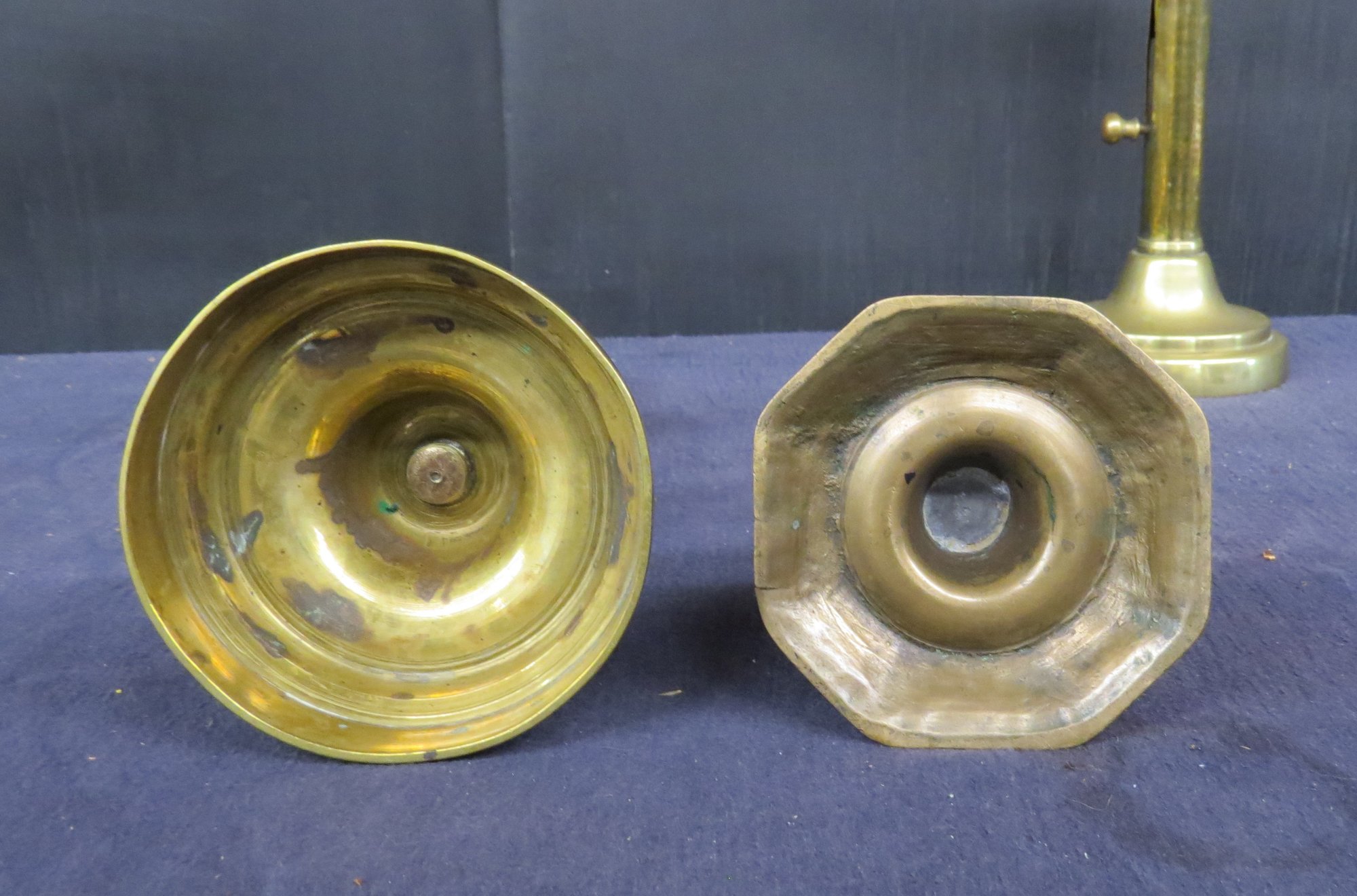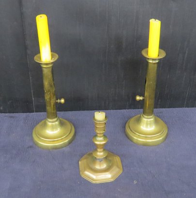 Pair brass hog scraper candle sticks 9” h. sold with one odd Queen Ann brass stick 6” h.
