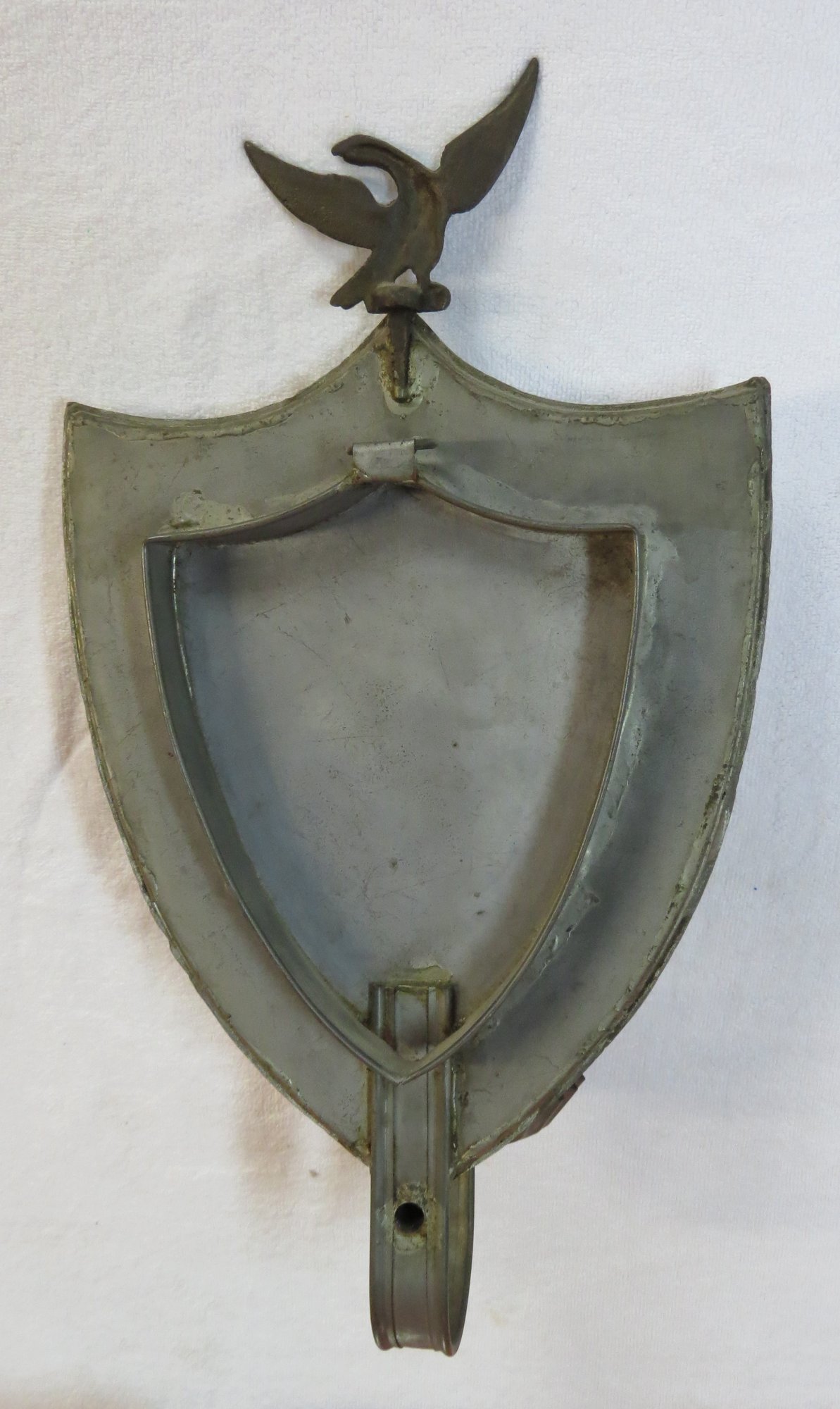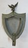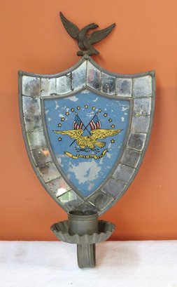 Pair shield shaped tin sconces with mirror, reverse painted panel of eagle, banner and flags with eagle finials, 13 ½” h. x 7 ¼” w.