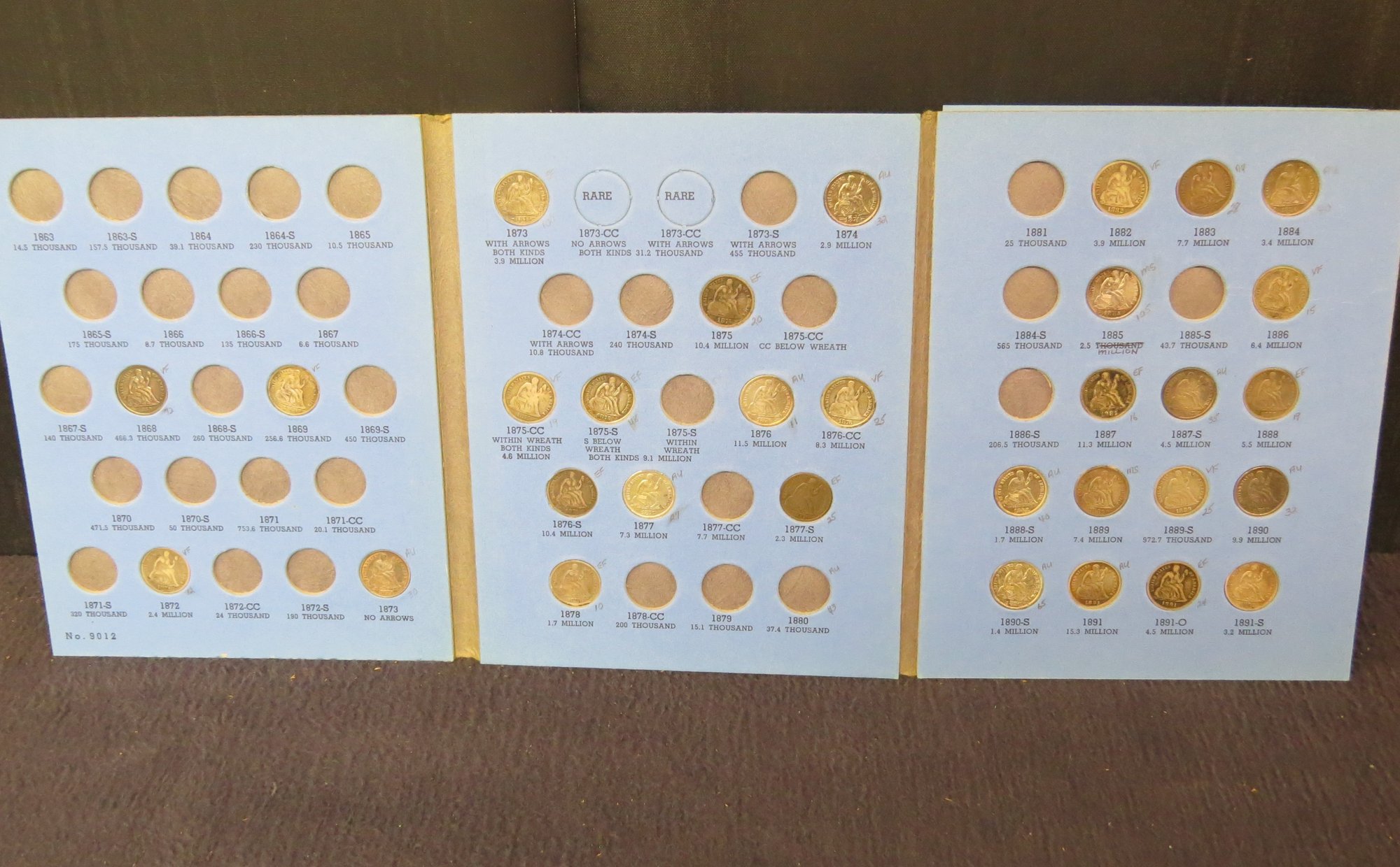 dimes consisting of; 1868, 1869, 1872, 1873 no arrows, 1873 with arrows, 1874, 1875, 1875 CC with wreath, 1875-S below wreath, 1876, 1876 CC, 1876-S, 1877, 1877-S, 1878, 1882, 1883, 1884, 1885, 1886, 1887, 1887-S, 1888, 1888-S, 1889, 1889-S, 1890, 1890-S, 1891, 1891-O, 1891-S
