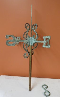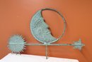 Astrological weathervane with directional, has half-moon with sun and star on the arrow which is 33 ½” w. circle around moon is 14 ½”, one S brace is off of directional but we have the piece, see pics