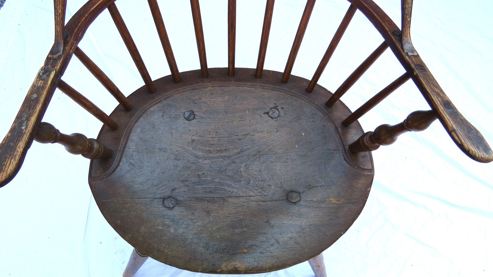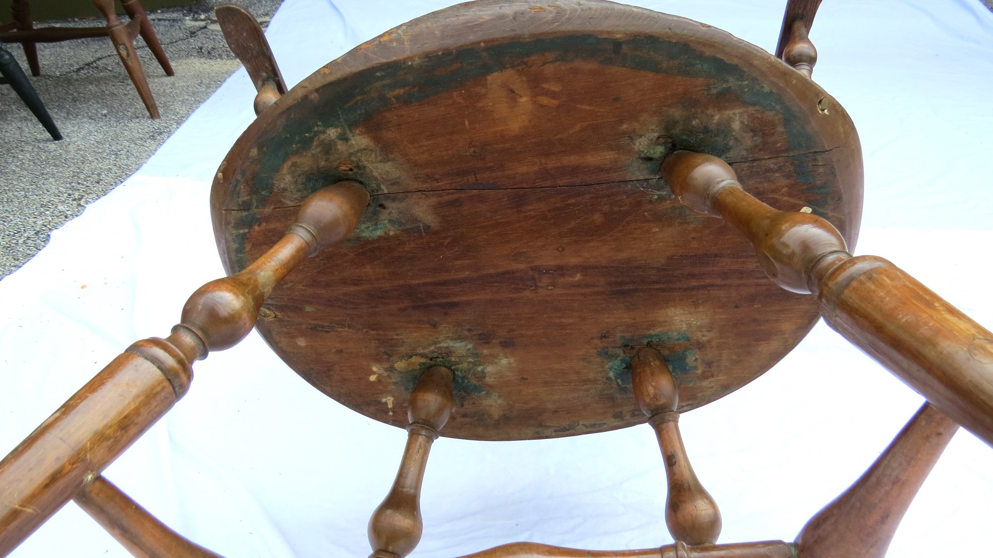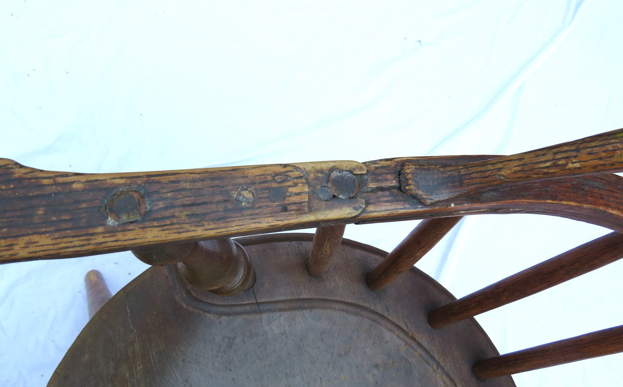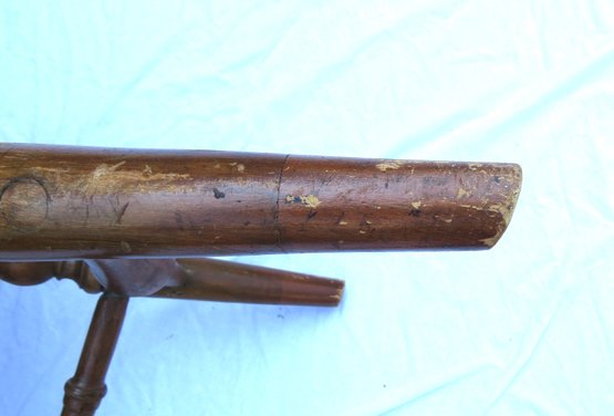 Bow back Windsor arm chair as is, has a repair to one arm and has had legs spliced. See pics, 35” h. seat height 18”