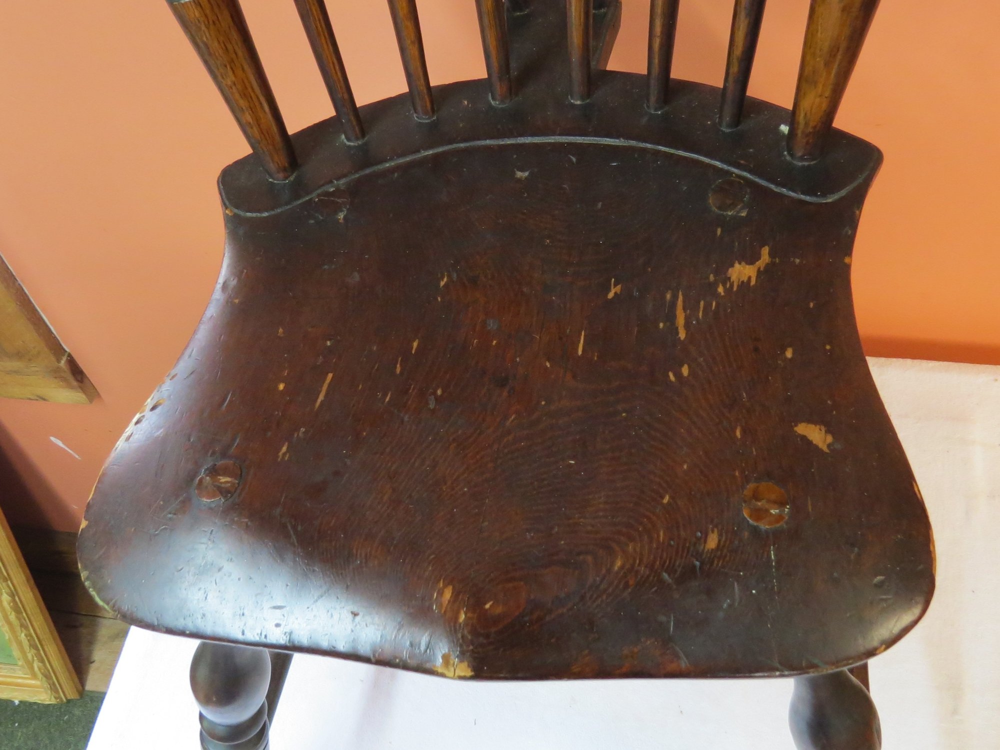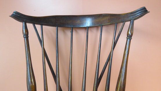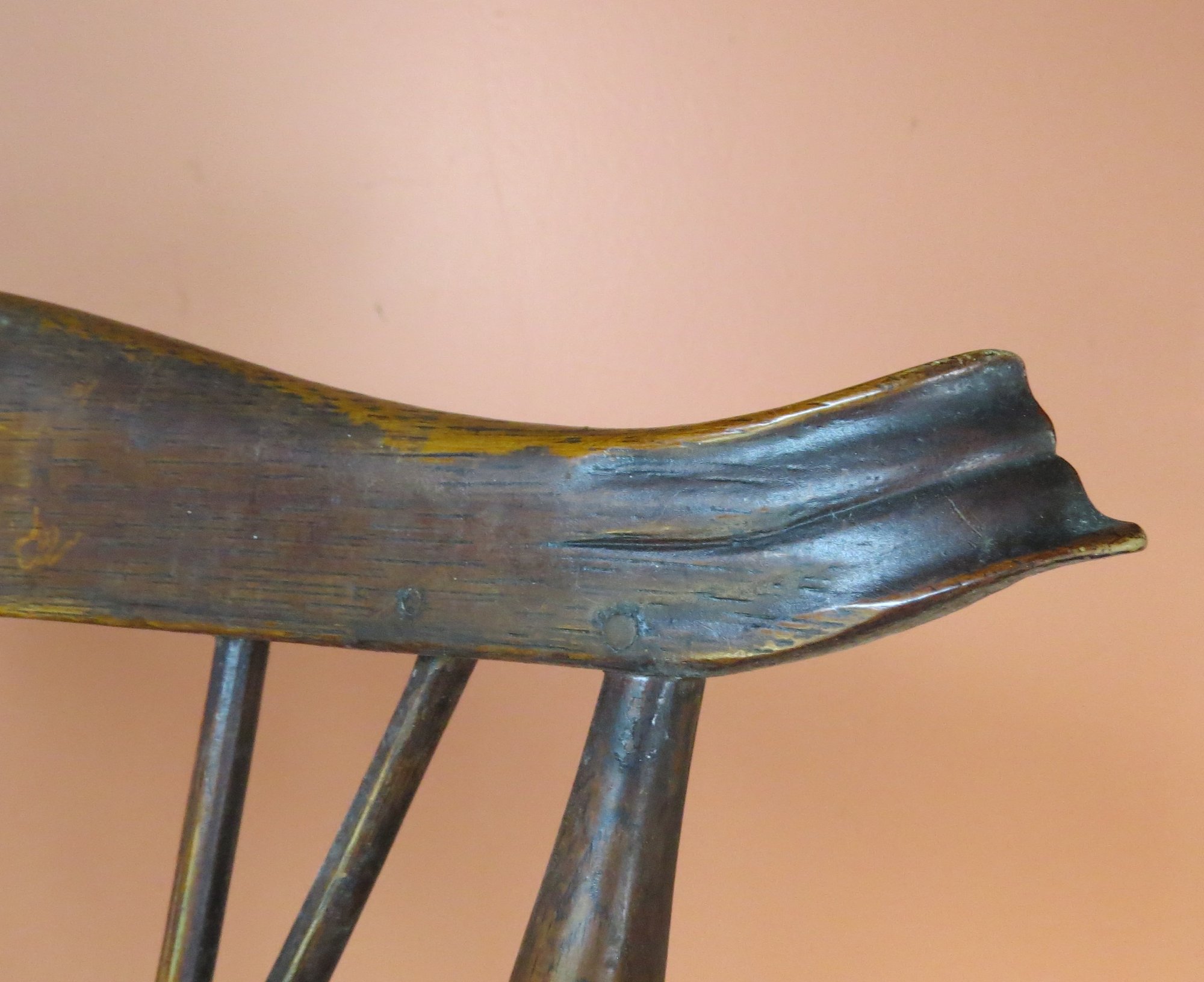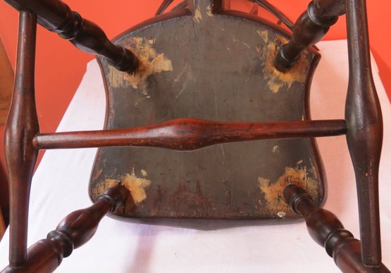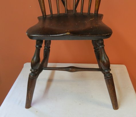Brace back fan back Windsor side chair with bulbous turnings, carved ears, saddle seat and medial stretcher, 36” h. x 16 ½” seat height