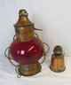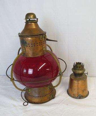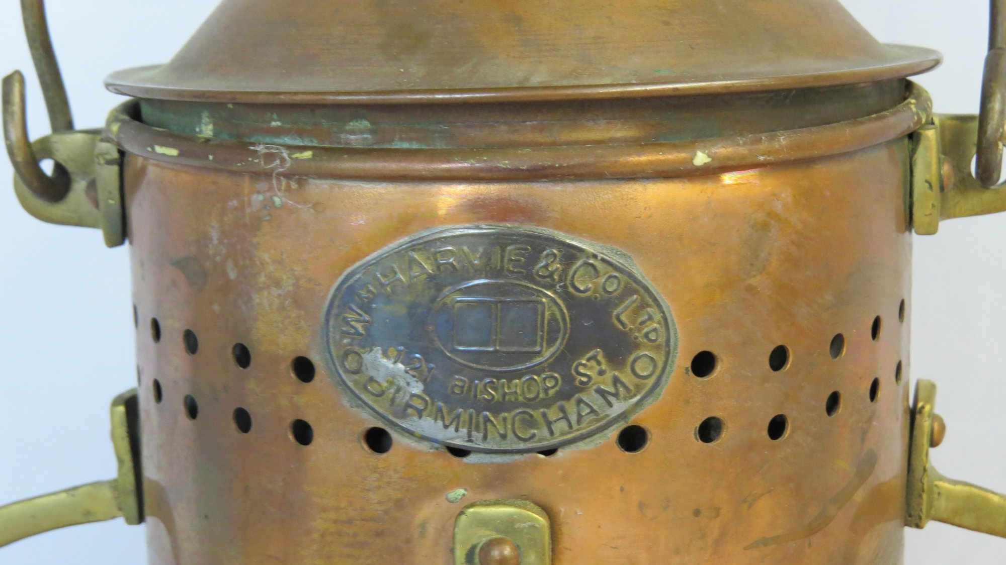 Brass and copper ships lamp with red onion shape glass with brass tag reading Wm. Harvie & Co. Birmingham, has original fluid burner, 17 ½” h. x apx. 13” w. cage