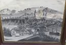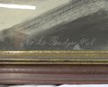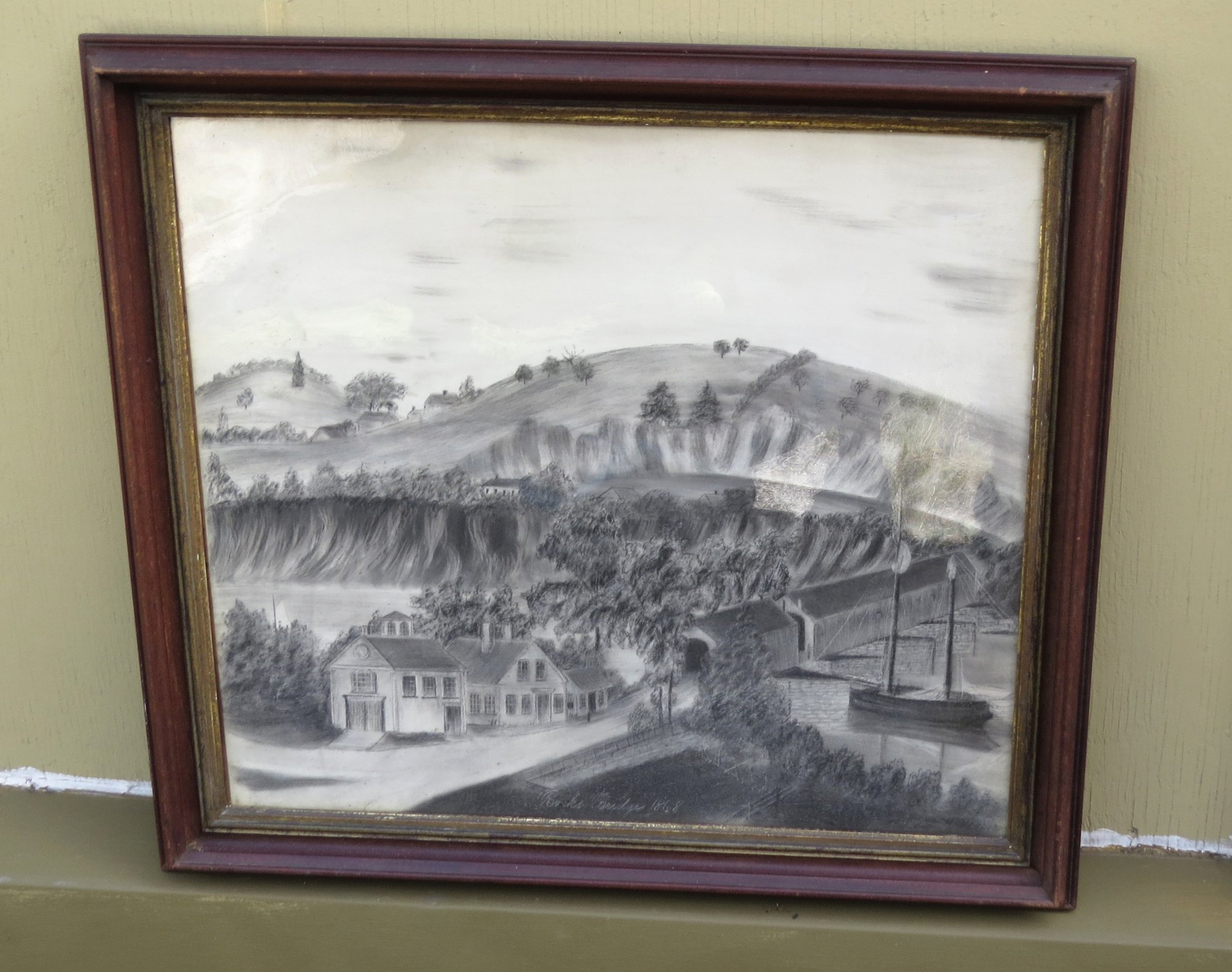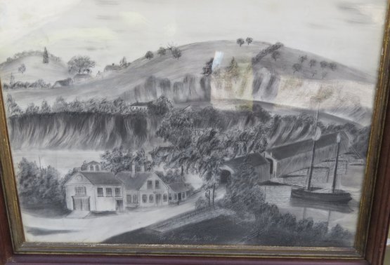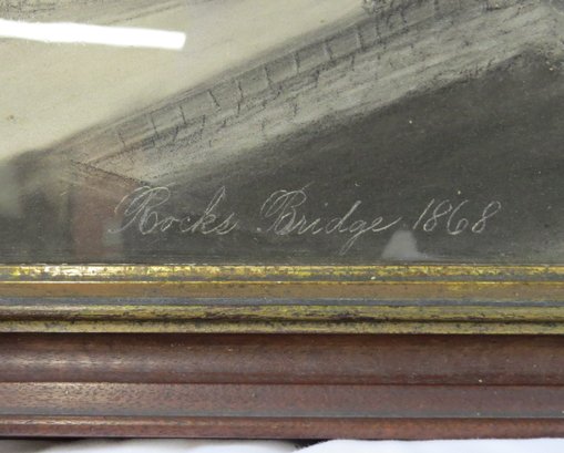 Charcoal painting with boat crossing under bridge titled “Rocks Bridge 1868” 20” x 22” original walnut frame