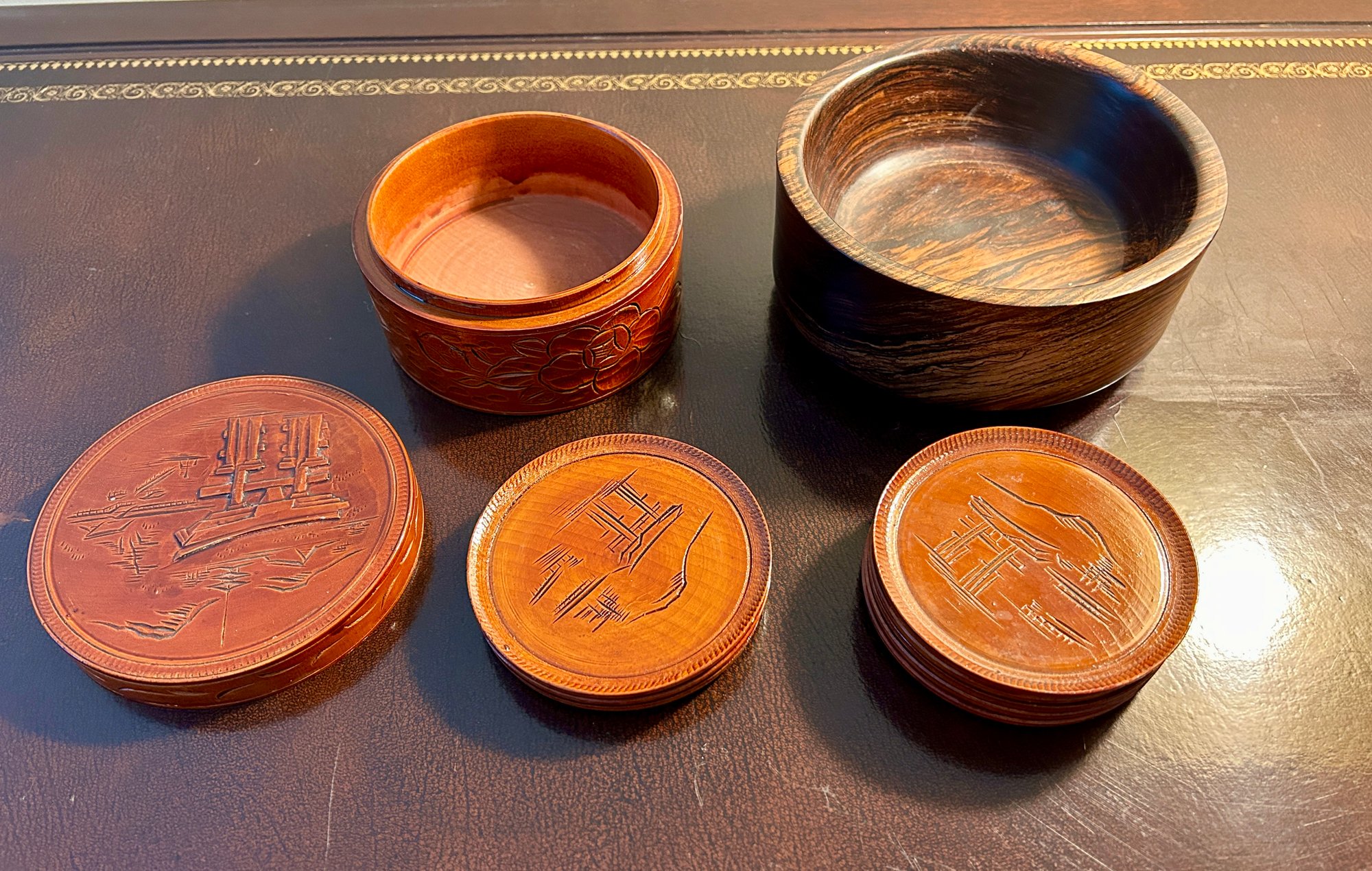 Cocobolo Wood 5 Inch Signed Bowl And Asian Themed Coaster Set