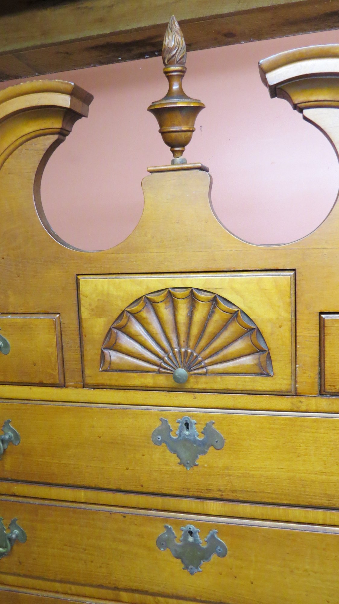 Custom made maple highboy with B. Altman New York label, 77 to top of finial, base 36” x 20” d. top 34” x 19 ½”
