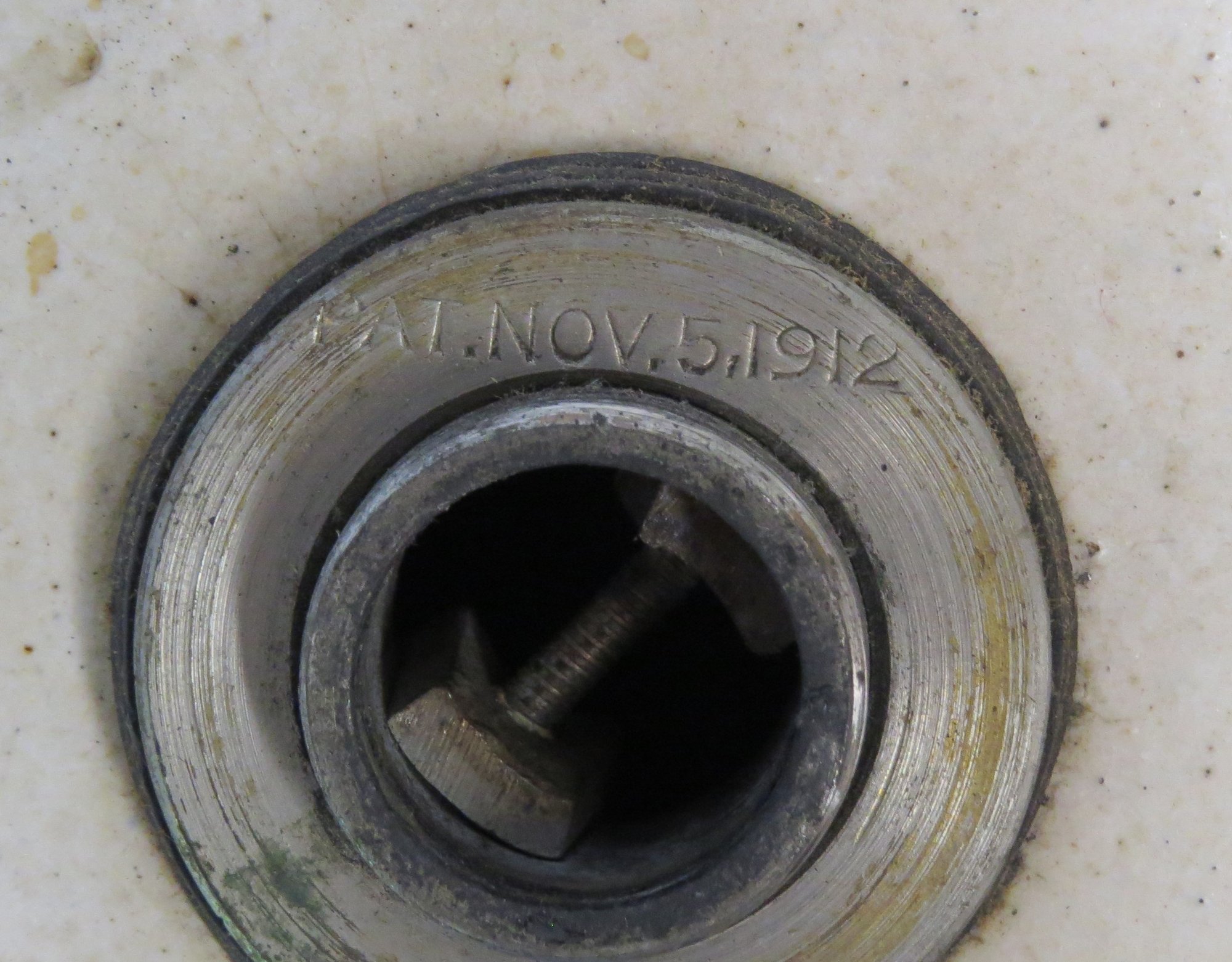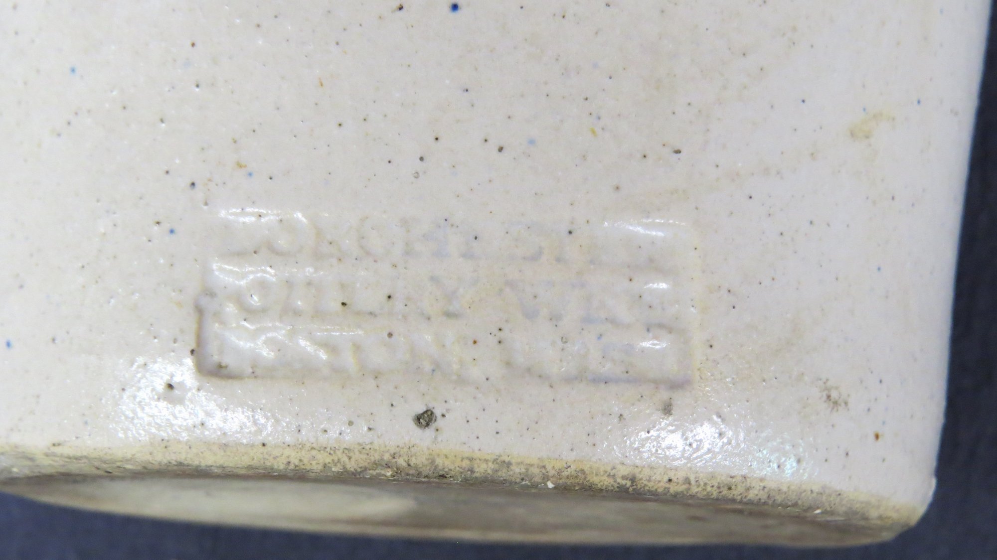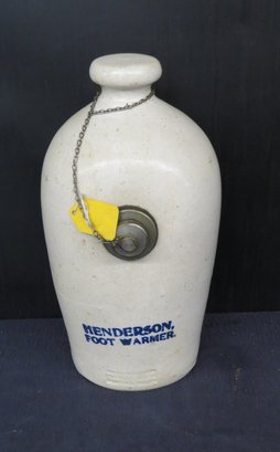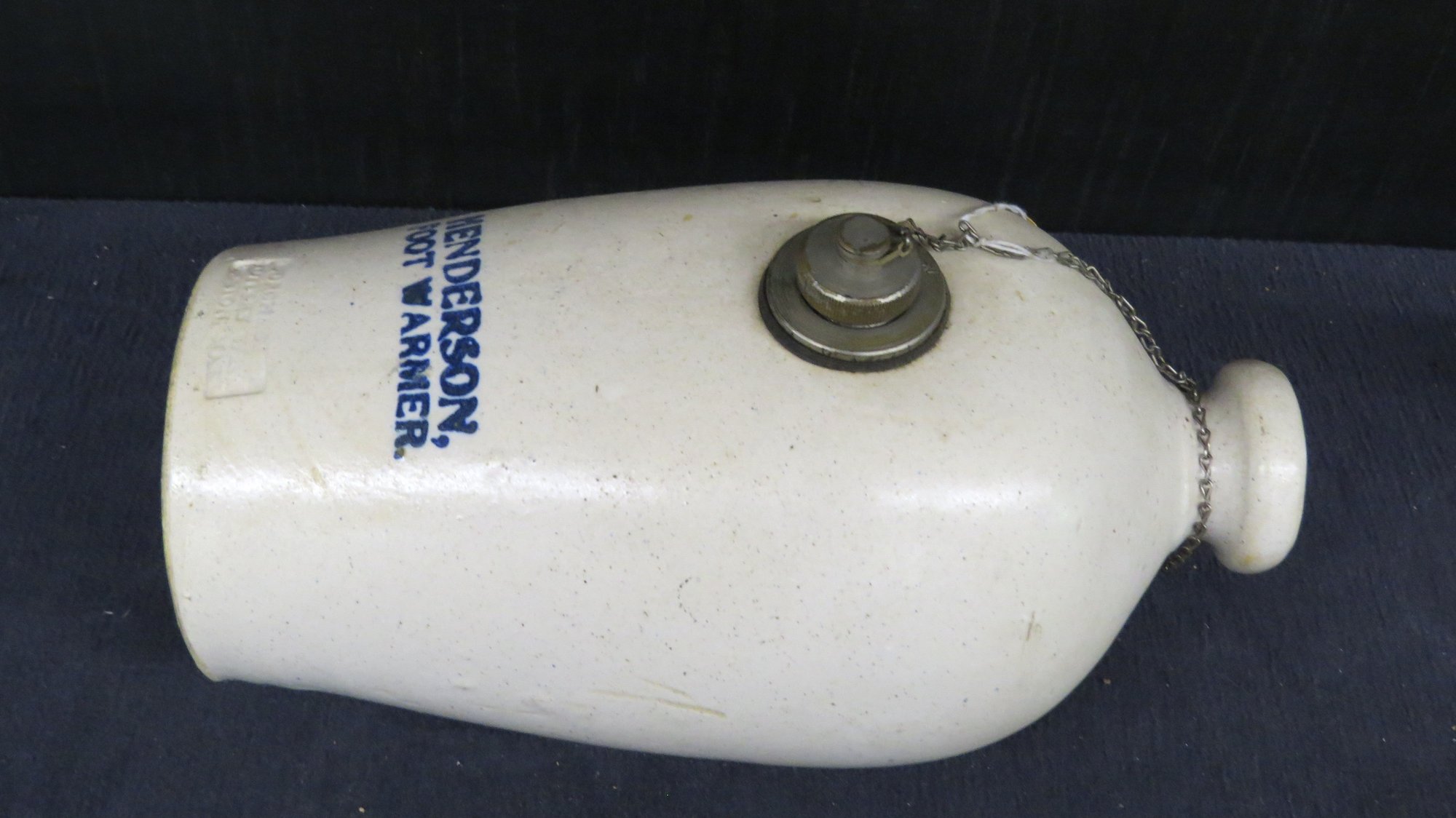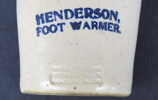 Pottery foot warmer with blue decoration reading “Henderson Foot Warmer” incised Dorchester Pottery Works Boston MA, marked on spout Pat 1912, 12” h. x 6” w.