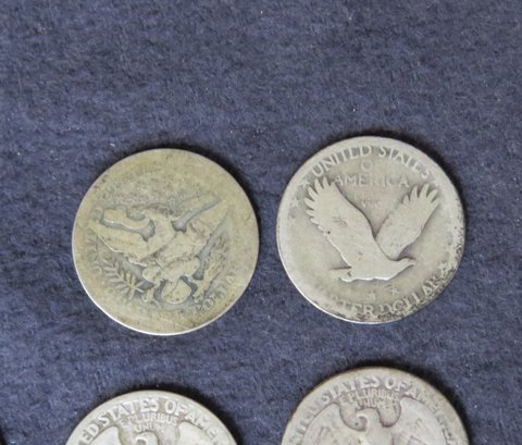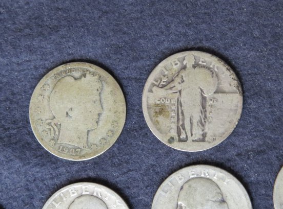 Lot of nine quarters, 1907 Barber quarter, Standing Liberty variety worn date, Washington quarters 1942, 1941-S, 1939, 1940, 1938, 1939, 1941-D