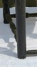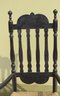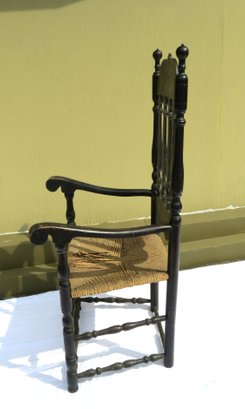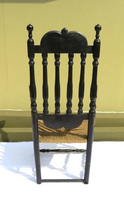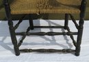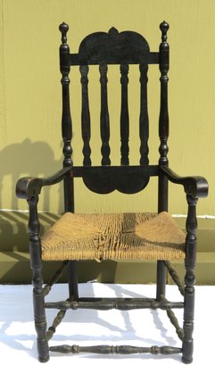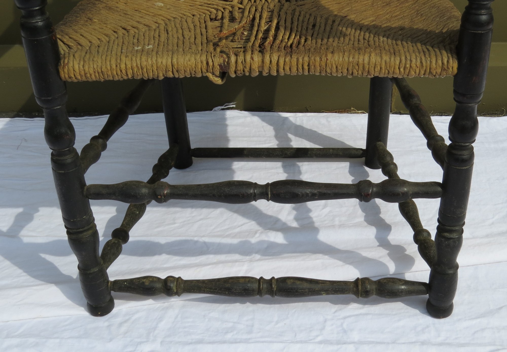 Early 18th century Banister back arm chair in black paint, 46” h. with 17” rush seat height, all 4 legs have been spliced, see pics