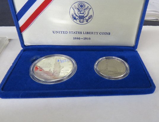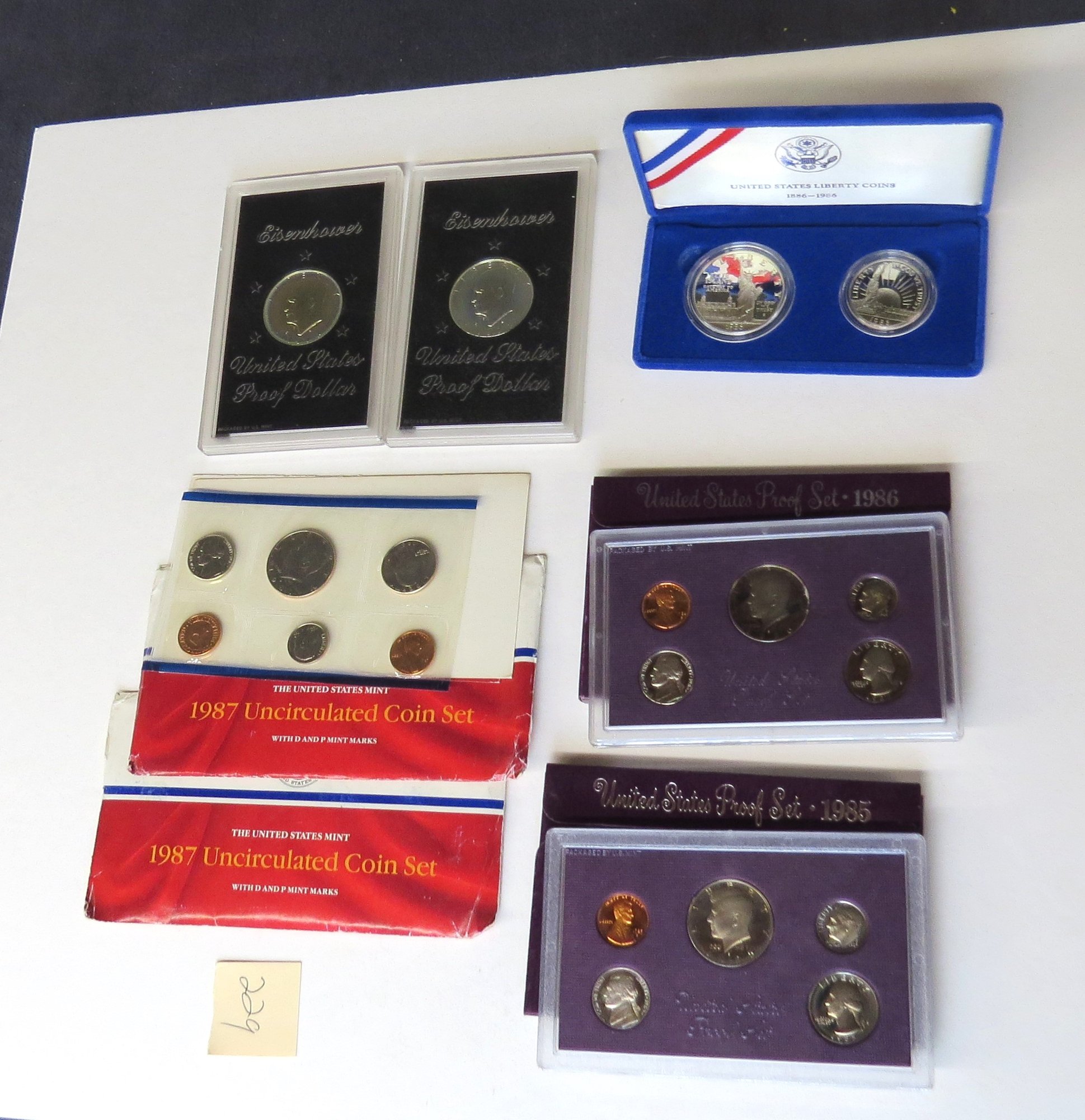 Lot consisting of two Eisenhower proof dollars 1974, two 1987 uncirculated coin set, United States Liberty coins 1868-1986 silver coins, 1986 U.S. Proof set, 1985 U.S. Proof set