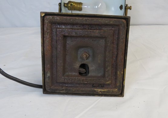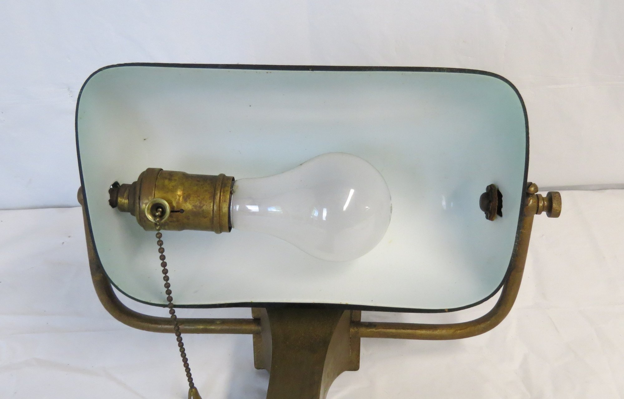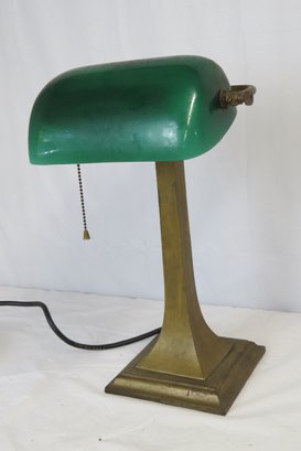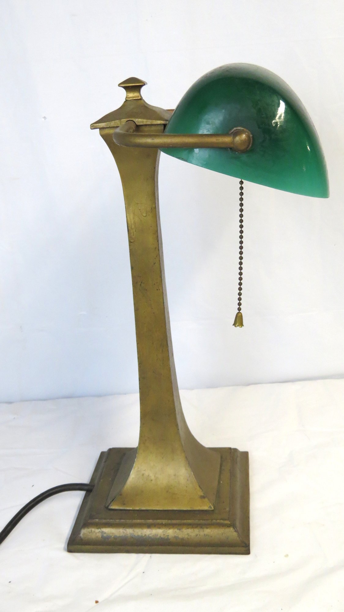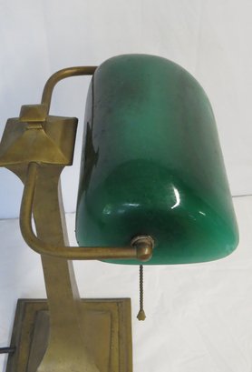 Emeralite green cased glass desk lamp with brass base, shade 9” x 5 ½”, lamp stands 16” h. base 7” x 7”