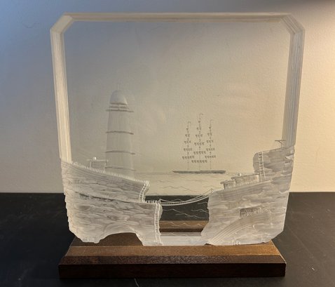 Etched Art Glass - Ship And Lighthouse On Stand 8.5x8.5
