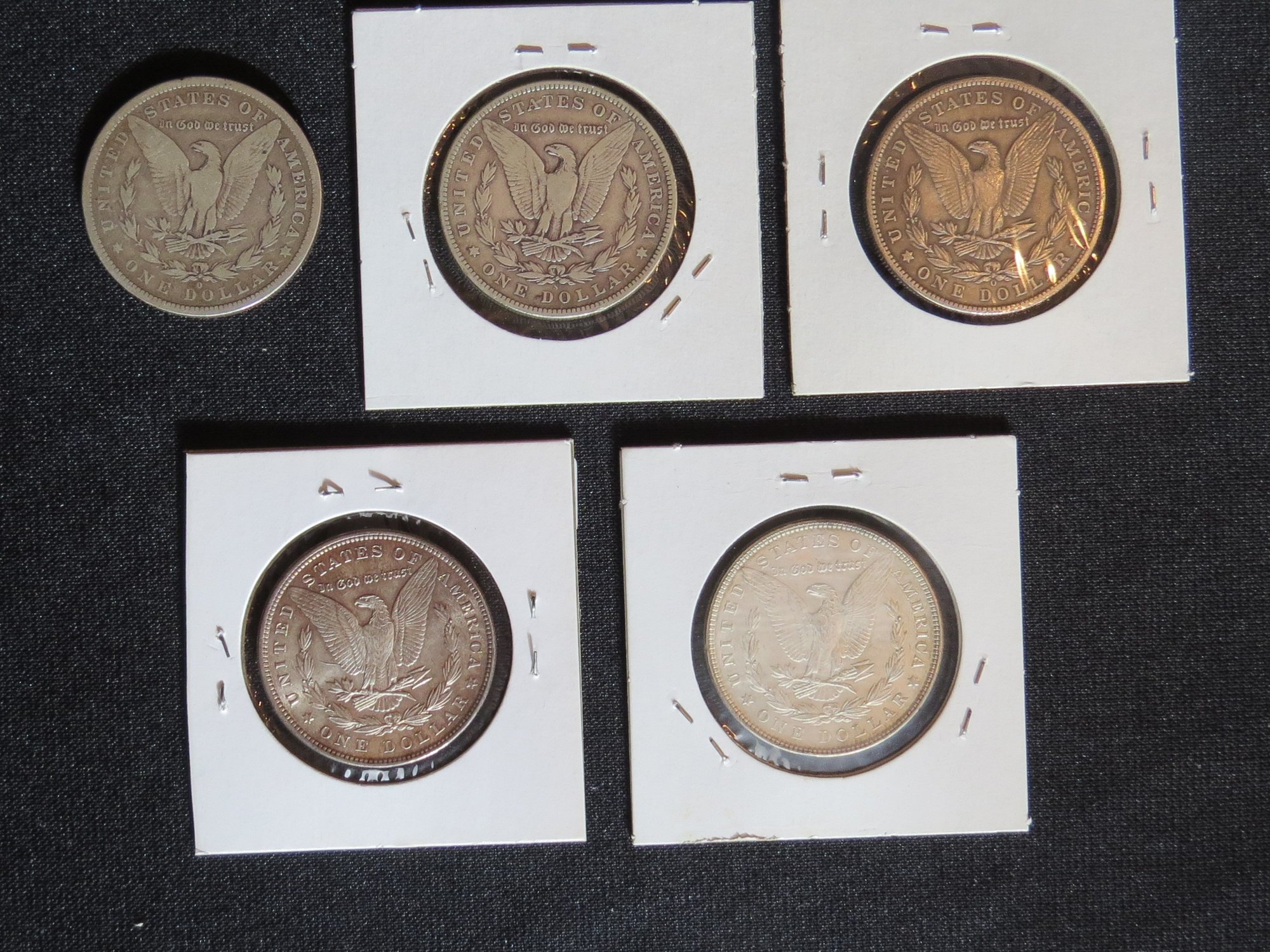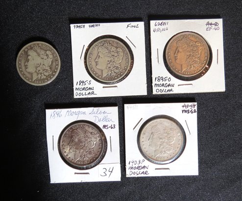 Five Morgan Silver Dollars, 1881-O, 1895-S F, 1895-O EF-40, 1896 MS-63, 1903-P MS-62