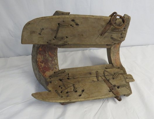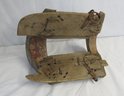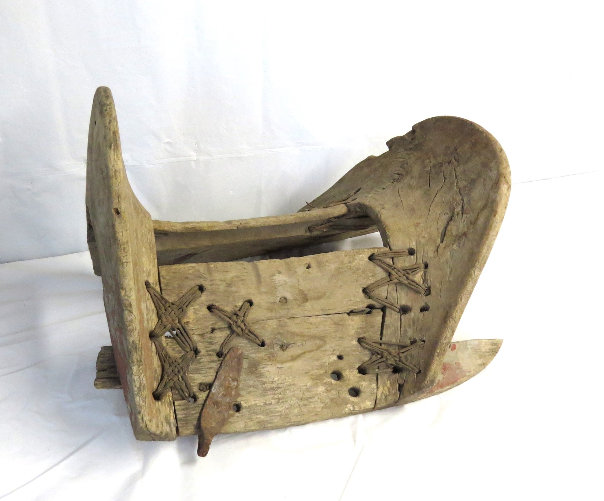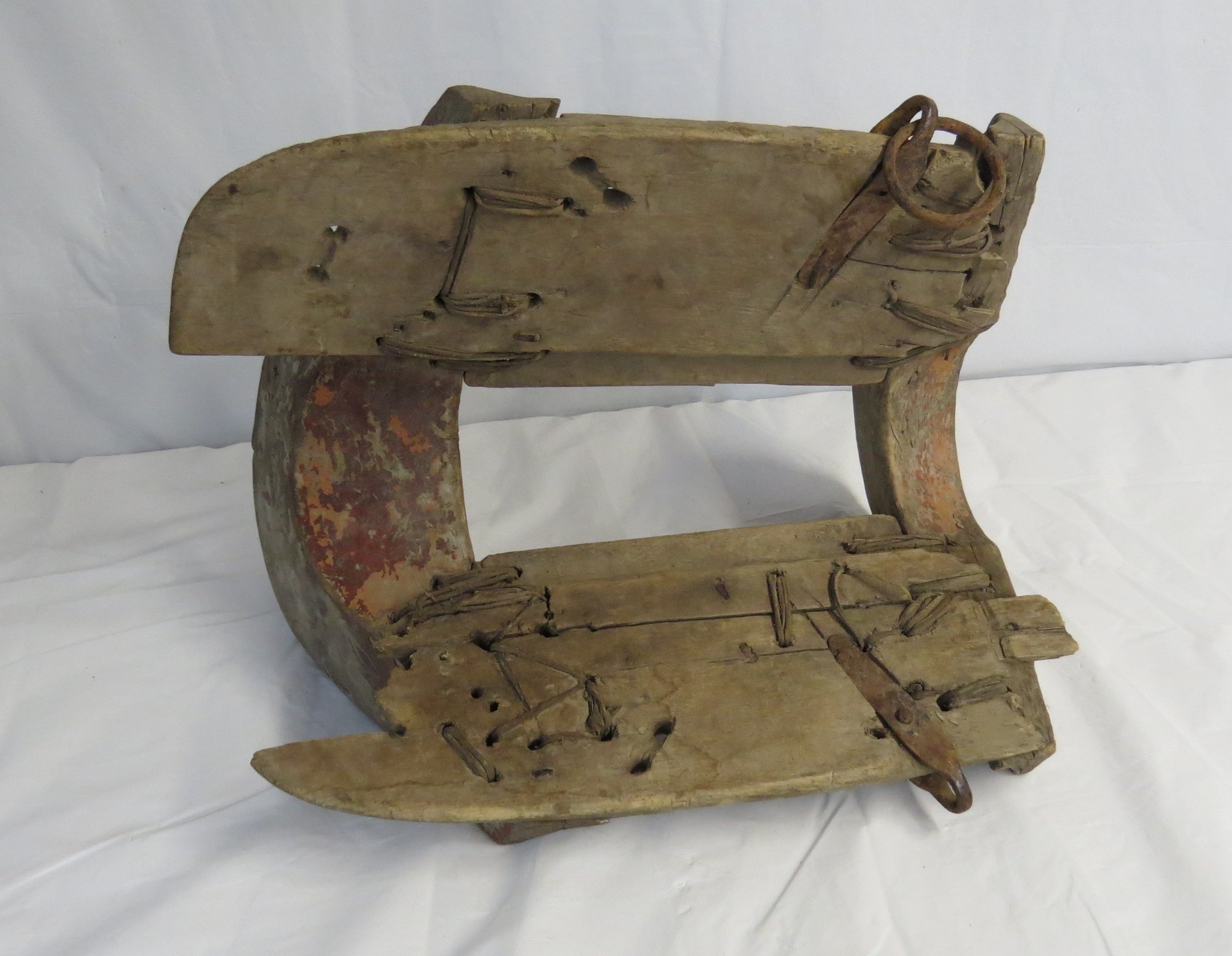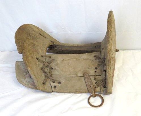 Foreign wooden saddle with metal fittings and rope stitching, 15” l. x 10” h. x 10” h.