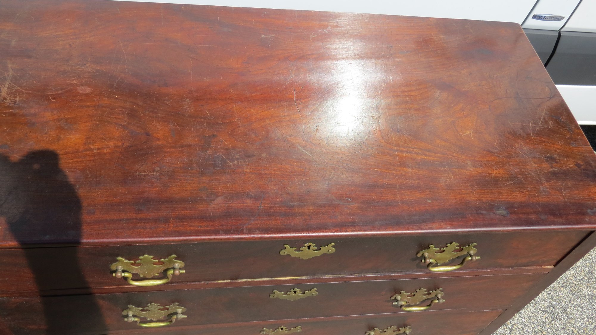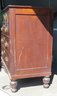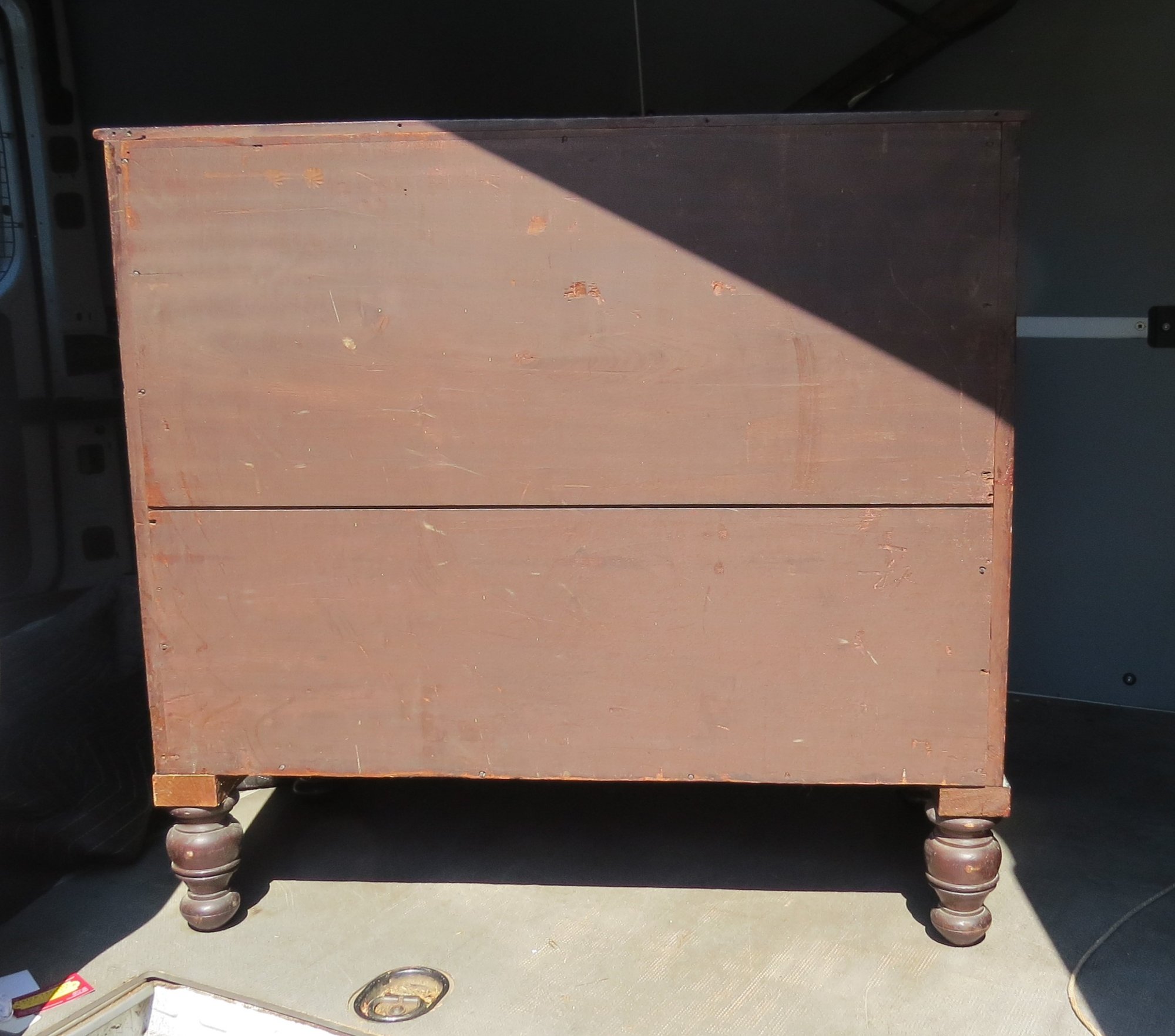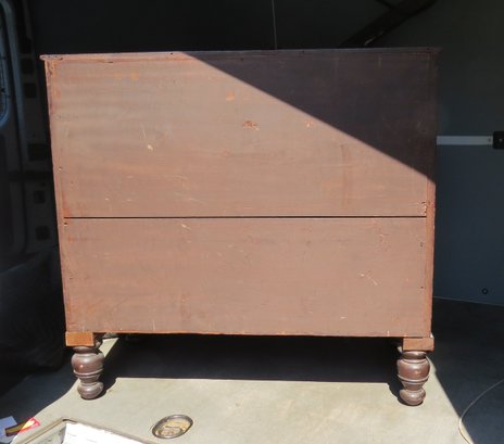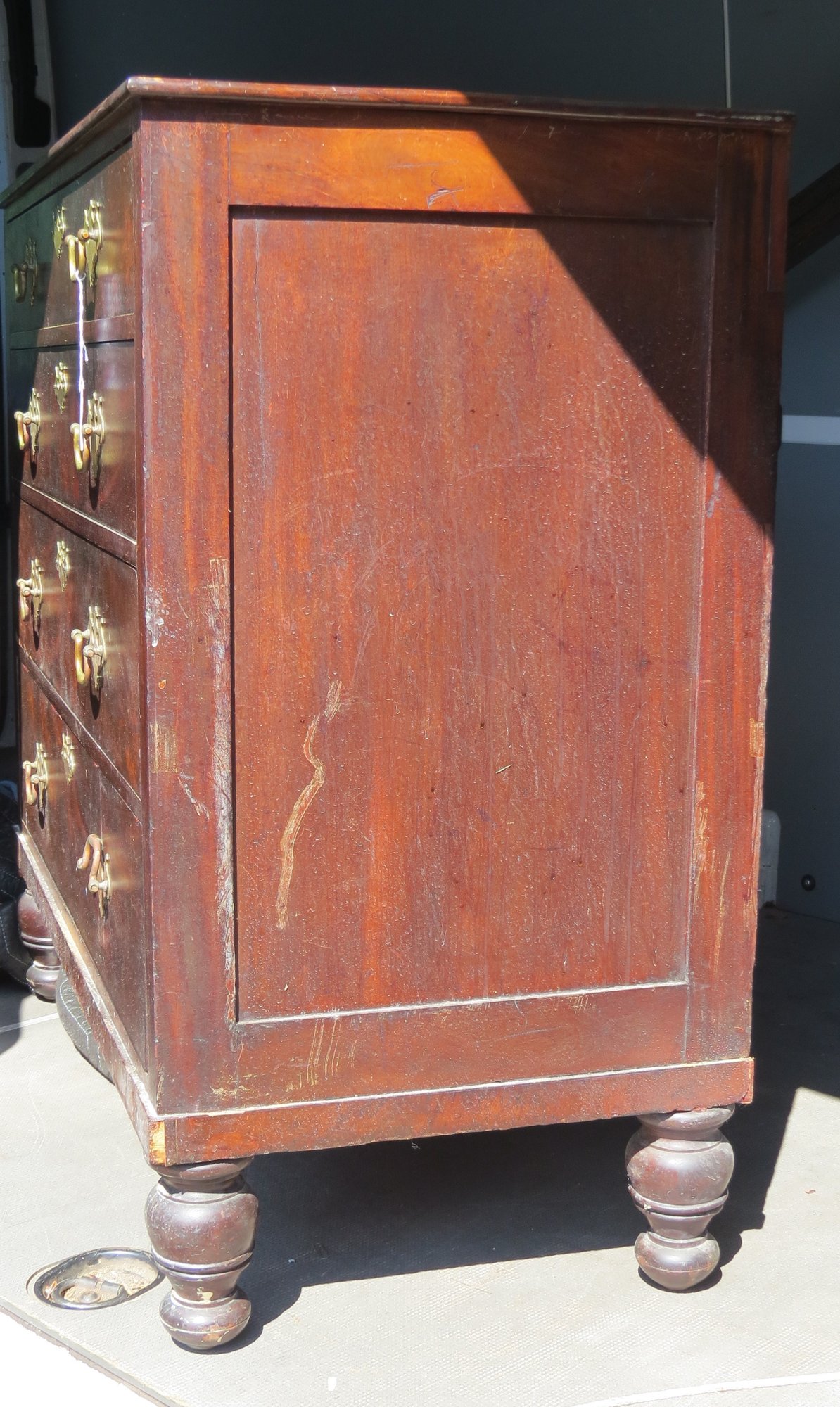 Four drawer mahogany chest with turned feet, has reproduction Chippendale hardware,