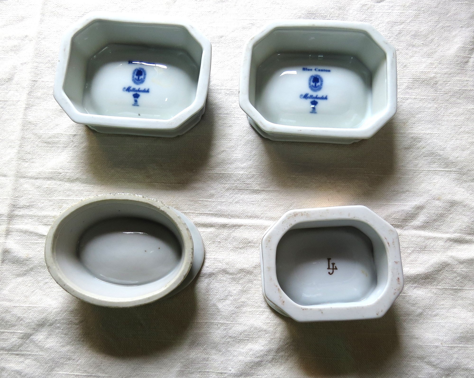 Four reproduction open salts, two Canton 4 ½” x 3 ½”and two export porcelain copies