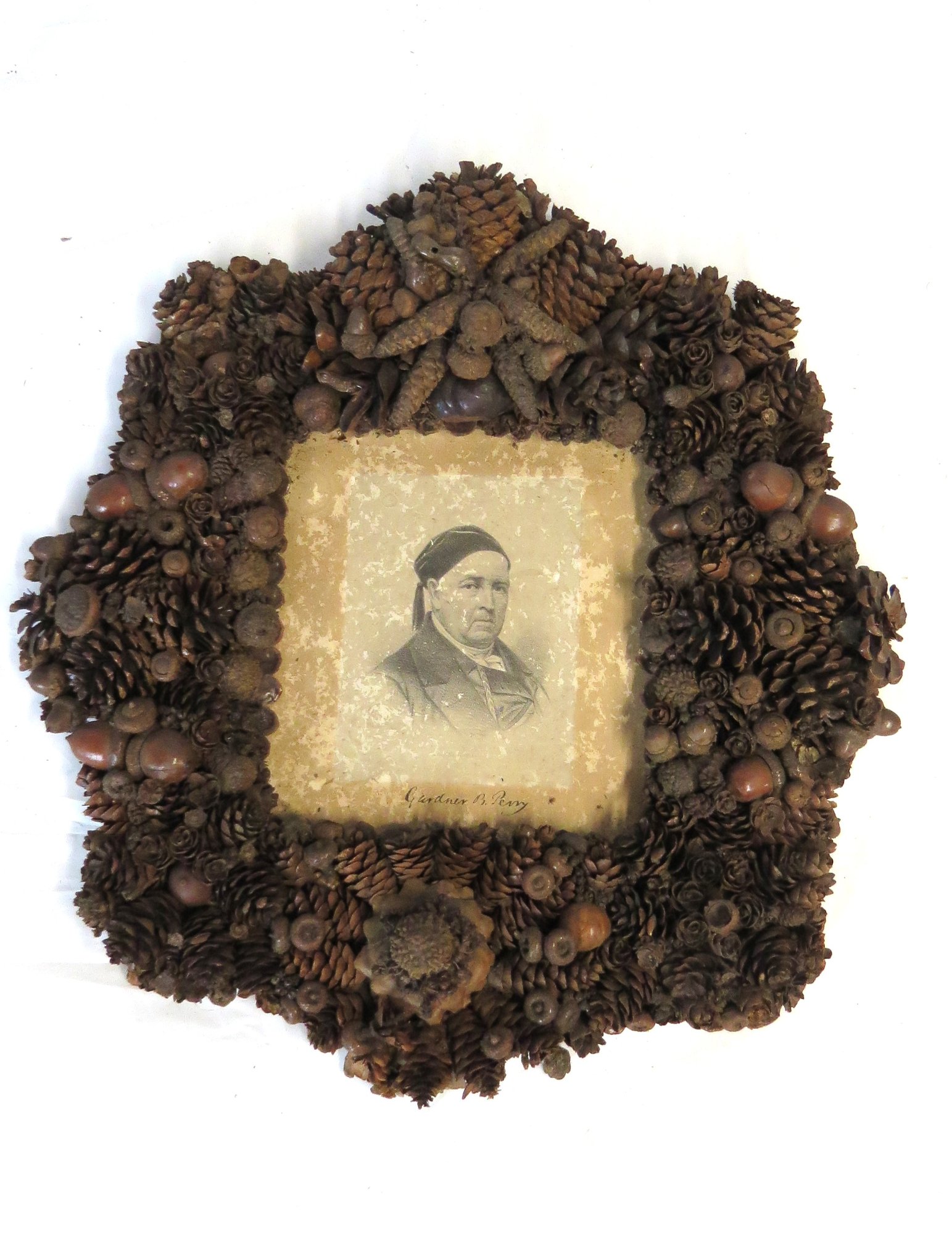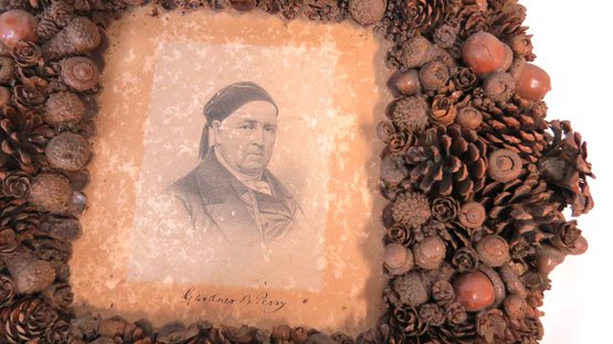 Frame made from a collage of pine cones and acorns, 14” x 13” holding engraving of Gardner E. Perry