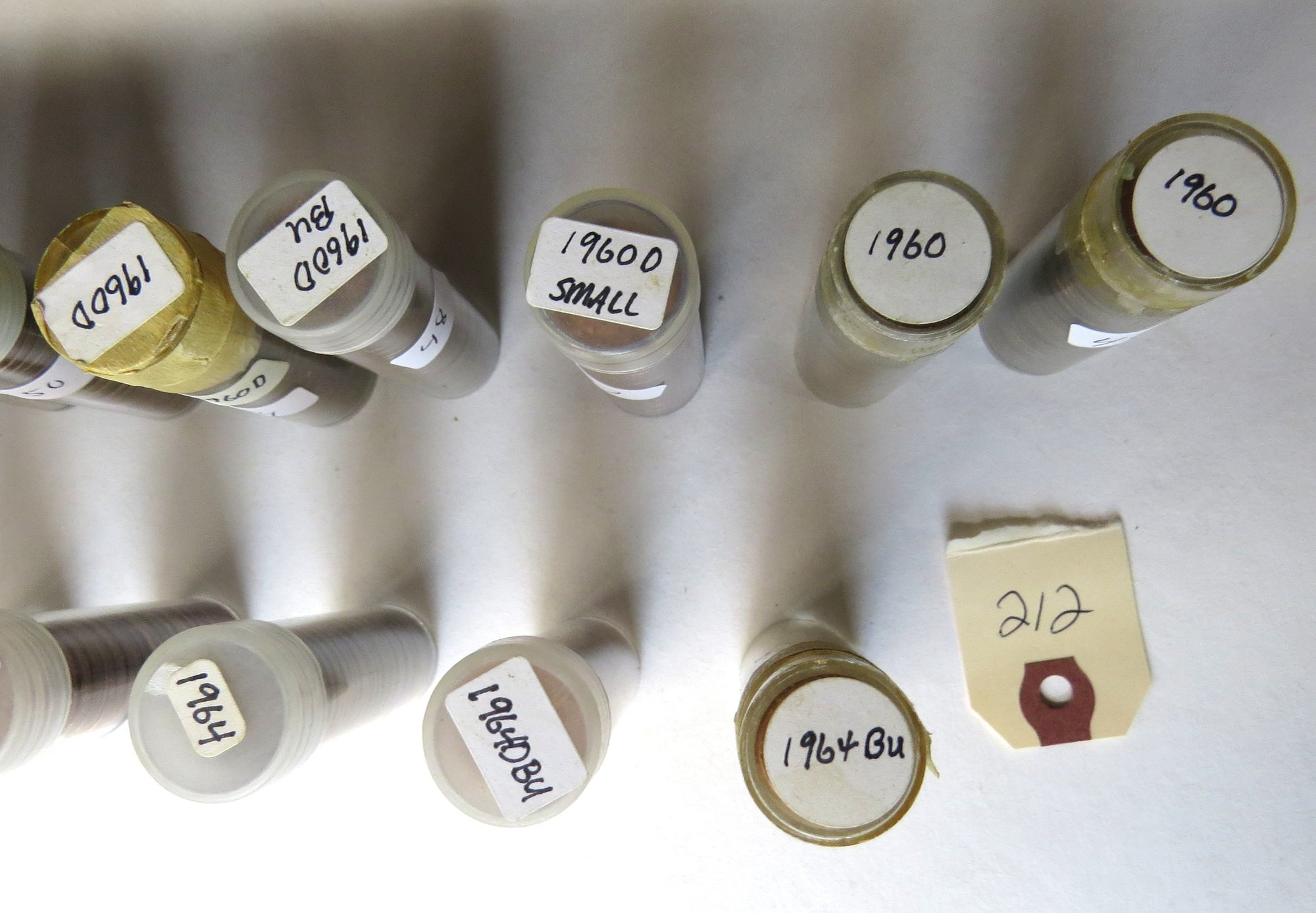 totals have been estimated and not guaranteed, approximately fifty-one 1959, approximately fifty 1960, apx fifty 1960, apx fifty 1960, apx fifty 1960-D, apx fifty 1960-D, apx. Thirty-eight 1960-D, apx. Forty-four 1960-D, apx. Forty-eight 1960-D, apx. Forty-seven 1960-D small, apx. Fifty 1960, apx. Forty 1968, apx. Forty-five mixed 1961, 62, 63, apx. Forty--three 1962 and 1962-D, forty-seven 1961-D forty-nine 1963-D, apx. Forty-four 1963, apx. Forty-five 1965, apx. Forty-five 1964-D, apx. Forty-eight 1964, total of approximately 934 Memorial back pennies.