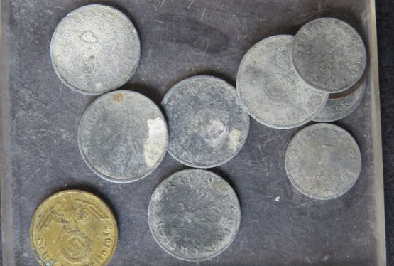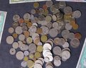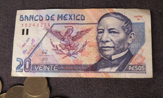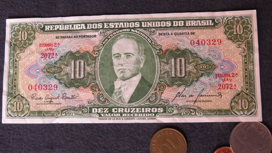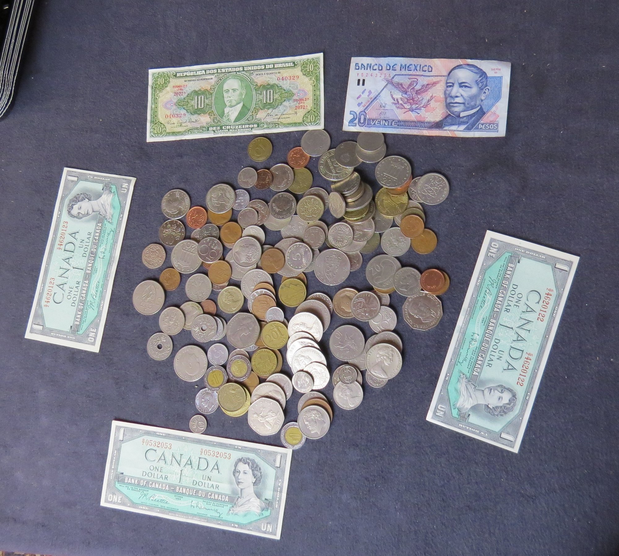 Large lot foreign coins and paper currency, three Canada dollar bills, Brazil note and Mexico note