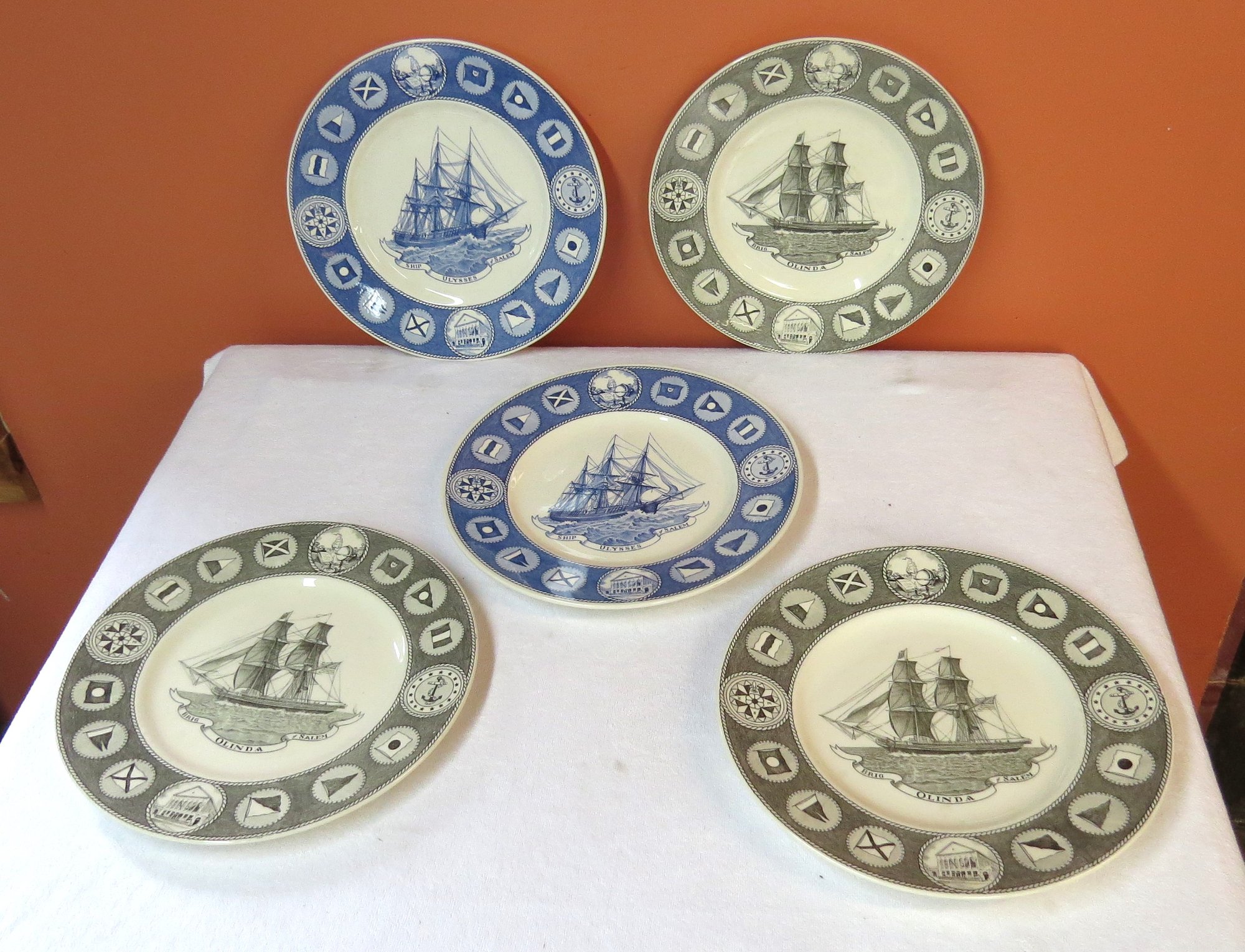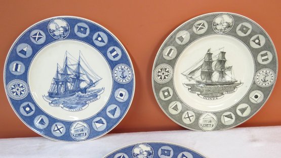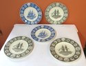 Lot of 5 Wedgewood nautical plates depicting the schooners Olinda and the Ulysses, 10 ½”