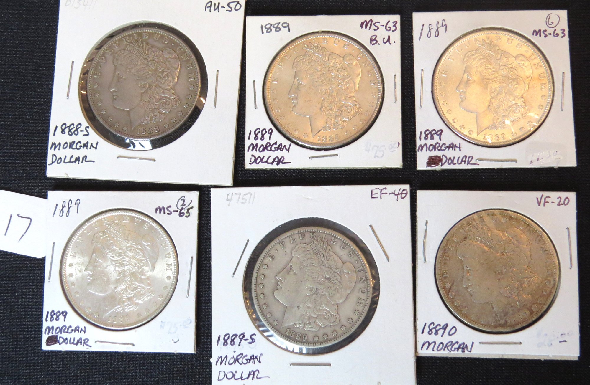 Lot 6 Morgan Silver Dollars - 1888-S, 1889, 1889, 1889, 1889-S, 1889-O