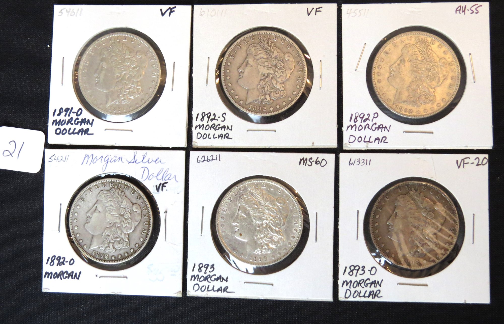 Lot 6 Morgan Silver Dollars - 1891-O, 1892-S, 1892-P, 1892-O, 1893, 1893-O