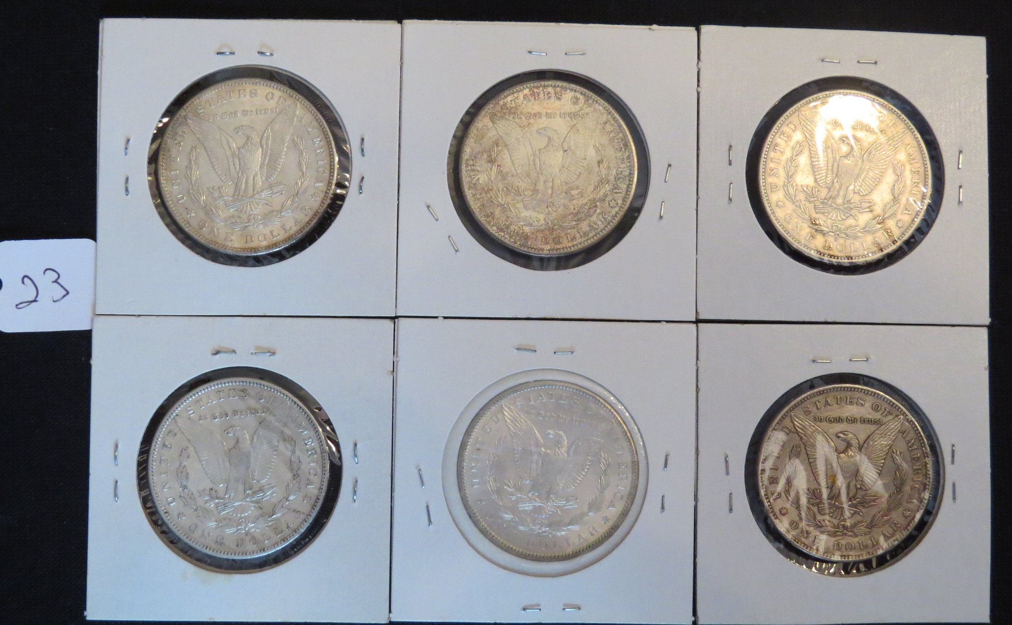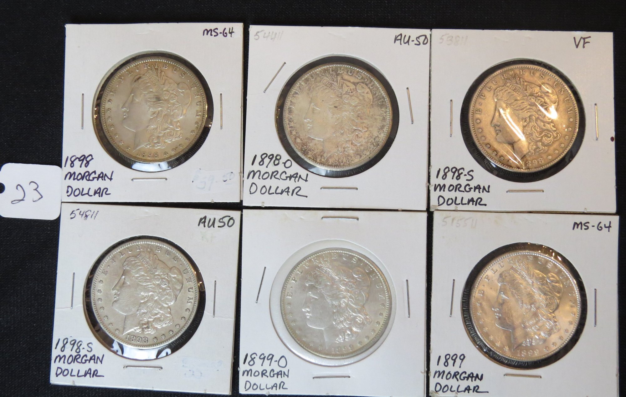 Lot 6 Morgan Silver Dollars - 1898, 1898-O, 1898-S, 1898-S, 1899-O , 1899