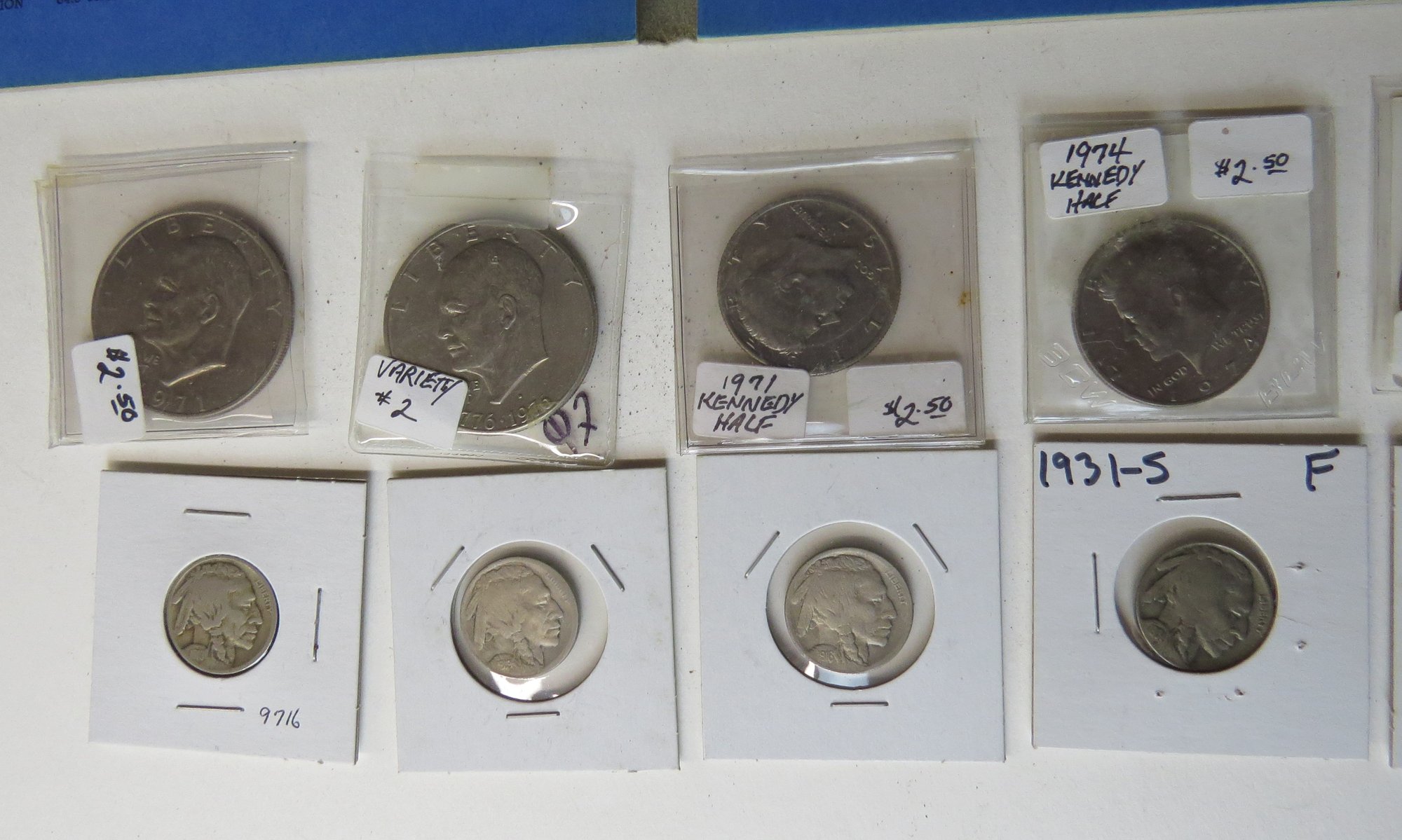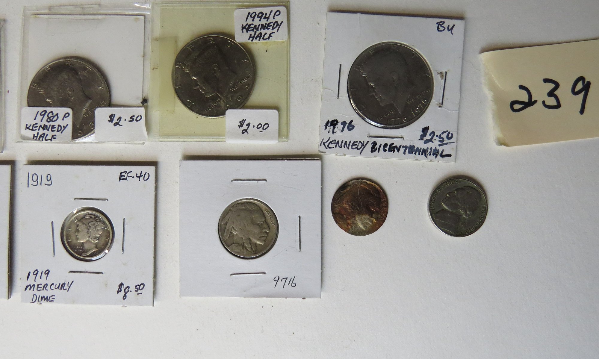 includes partial book Lincoln head pennies 1941-1974 missing 1943 steel , 1943-D, 1943-S, 1948-S, 1954-S, Eisenhower dollar 1971, Eisenhower Bi-Centennial variation #2, Kennedy halves include, 1971, 1974, 1980-P, 1994-P and Bi-Centennial Kennedy half dollars, Buffalo nickels include, two 1919, 1916, 1931-S, and 1918, Mercury dine 1919, one Jefferson nickel 1972