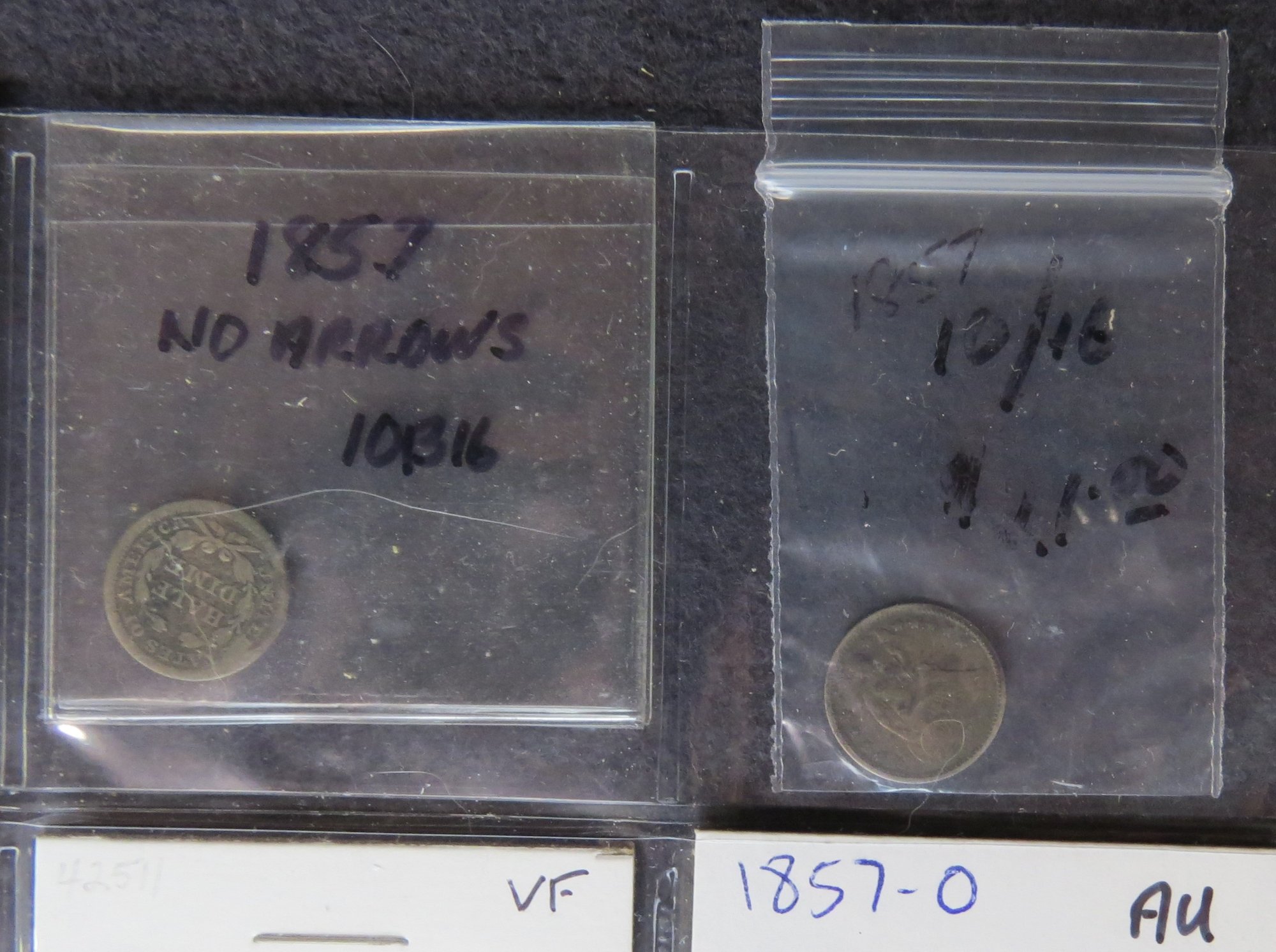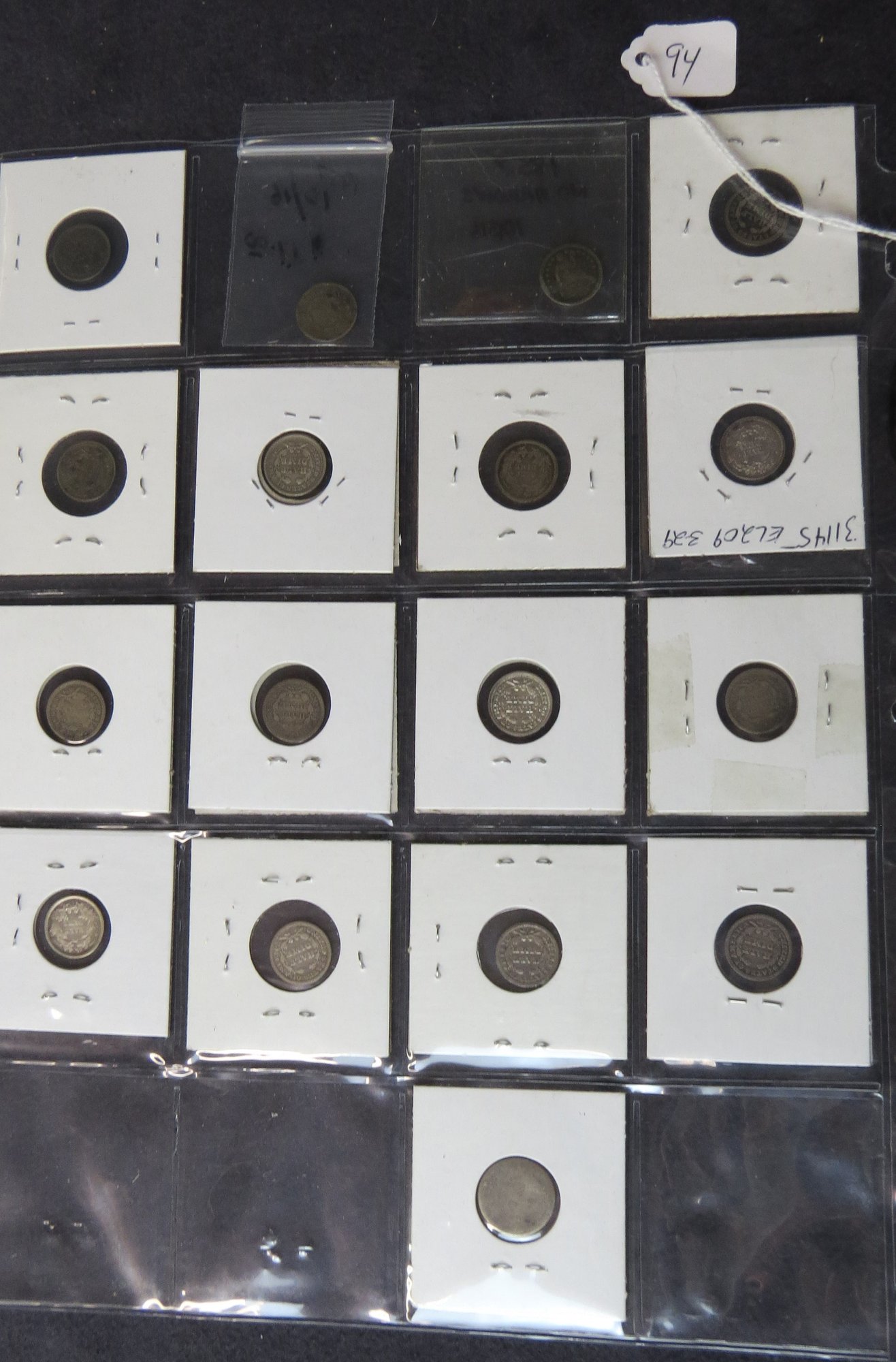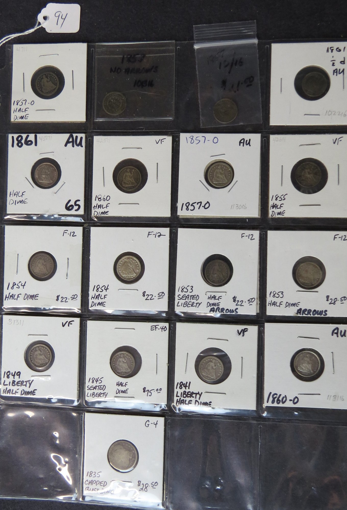 Lot of 16 Liberty Seated half dimes; 1857-O, 1857 no arrows, 1857, 1861, 1861, 1860, 1857-O1855, 1854, 1854, 1853, 1853, 1849, 1845, 1841, 1860, one 1835 capped bust
