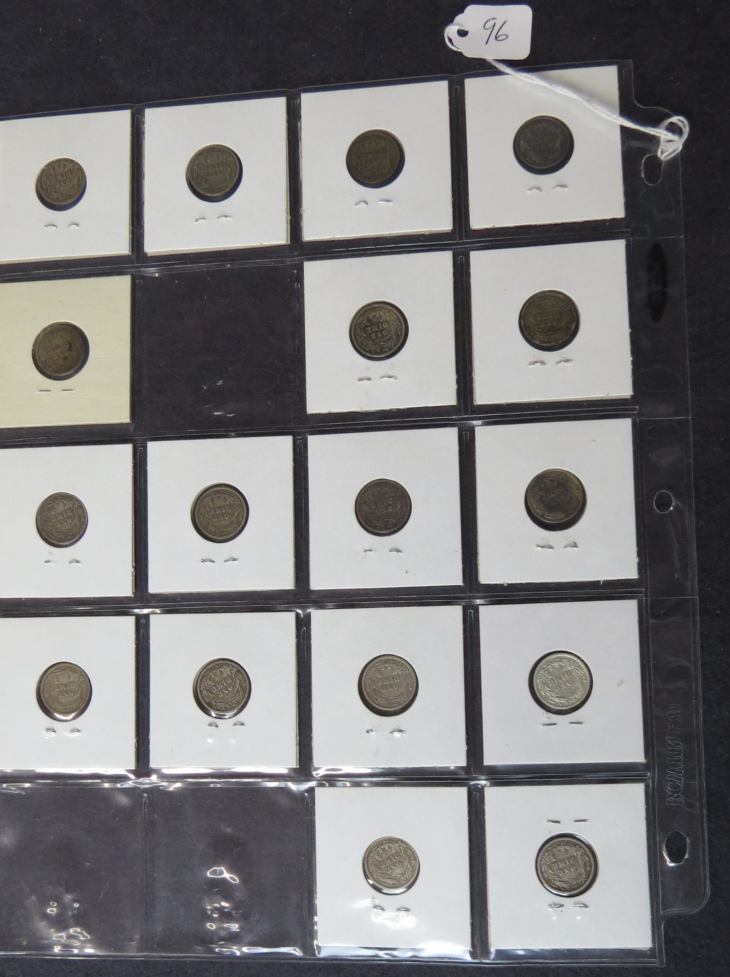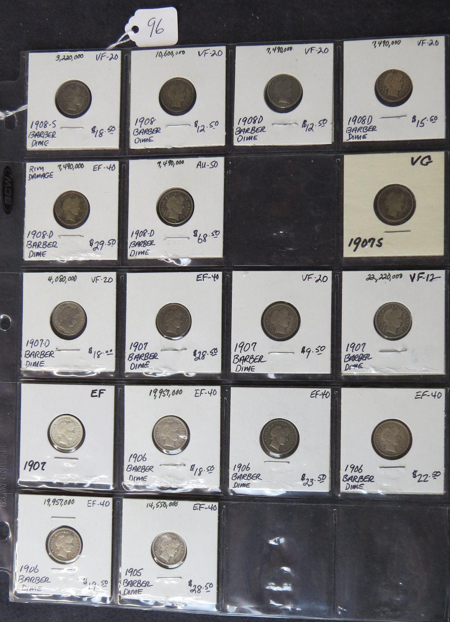 Lot of 17 Barber dimes; 1908-S, 1908, 1908-D, 1908-D, 1908-D, 1908-D, 1907-S, 1907-D, 1907, 1907, 1907, 1907, 1906, 1906, 1906, 1906, 1905
