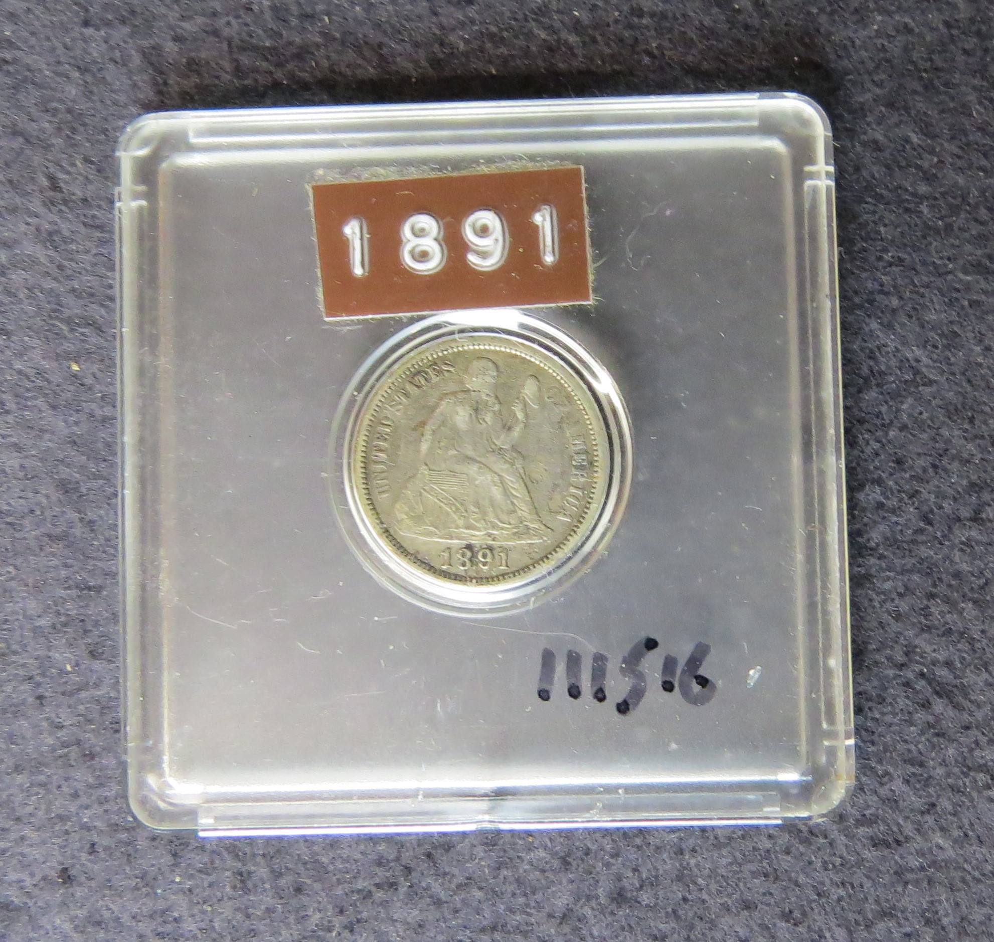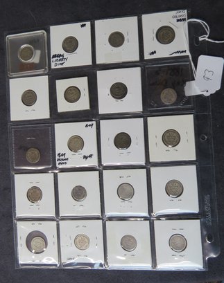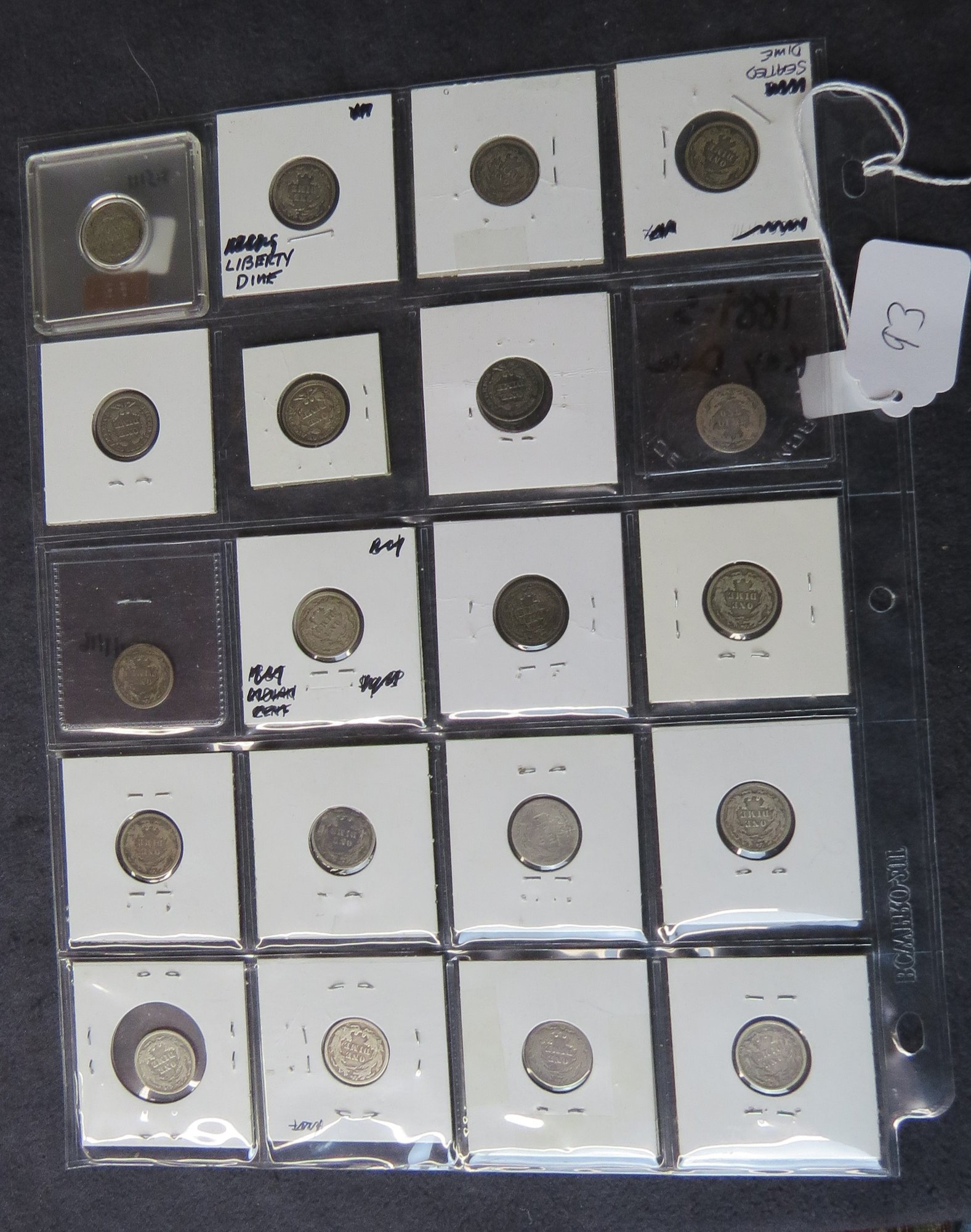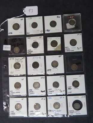 Lot of 20 Liberty Seated dimes; 1876, 1876, 1885, 1889-S, 1853, 1853, 1853, 1877, 1873, 1877, 1889-S, 1891, 1886, 1887, 1888, 1889, 1890, 1890, 1891