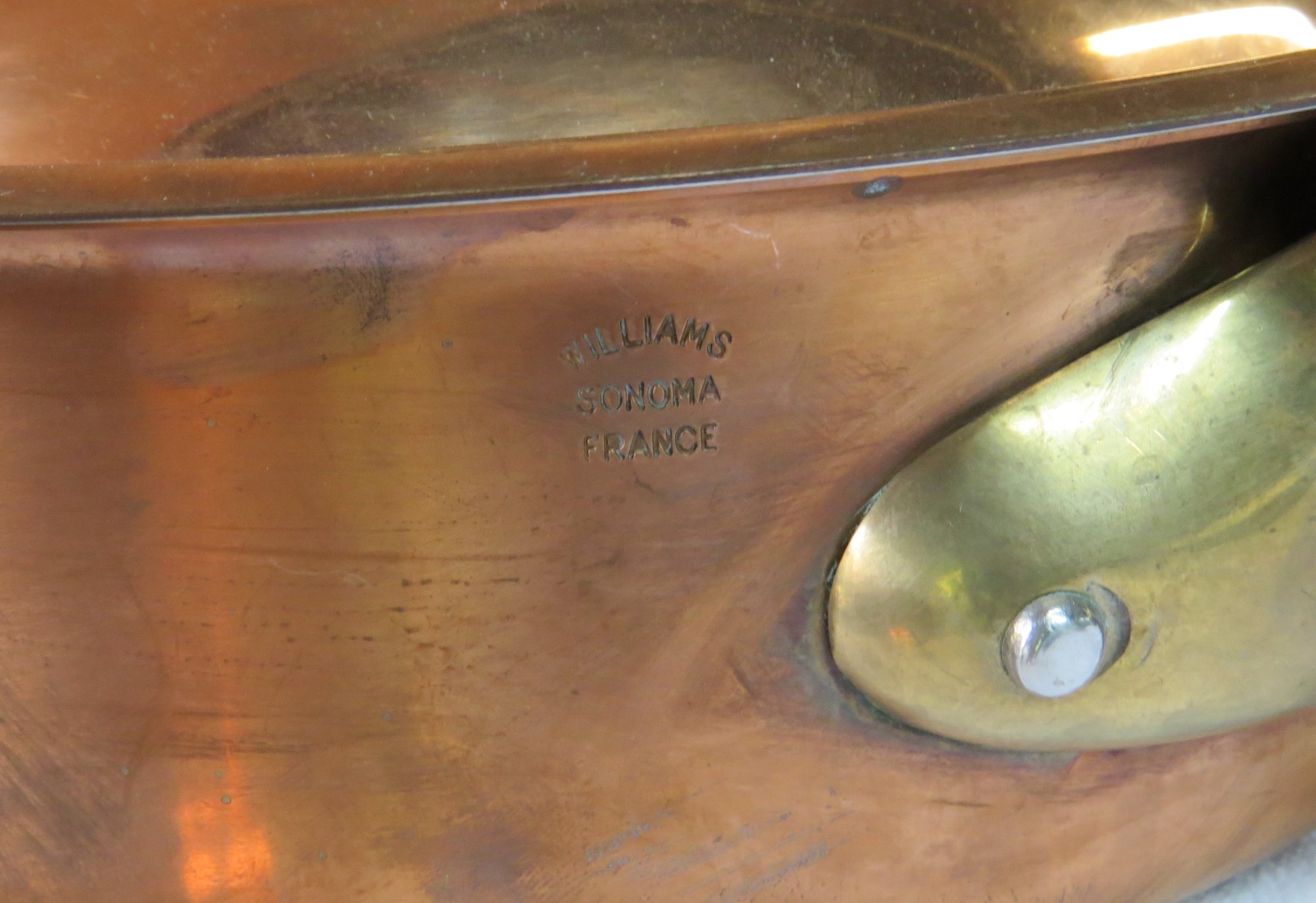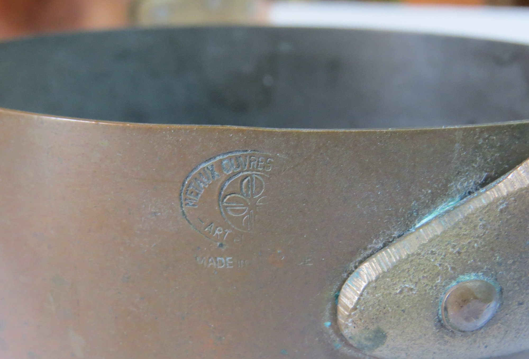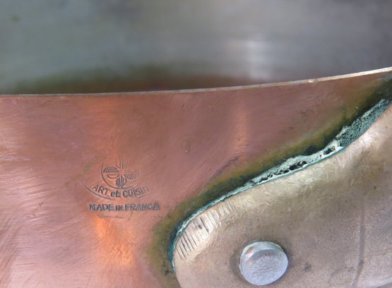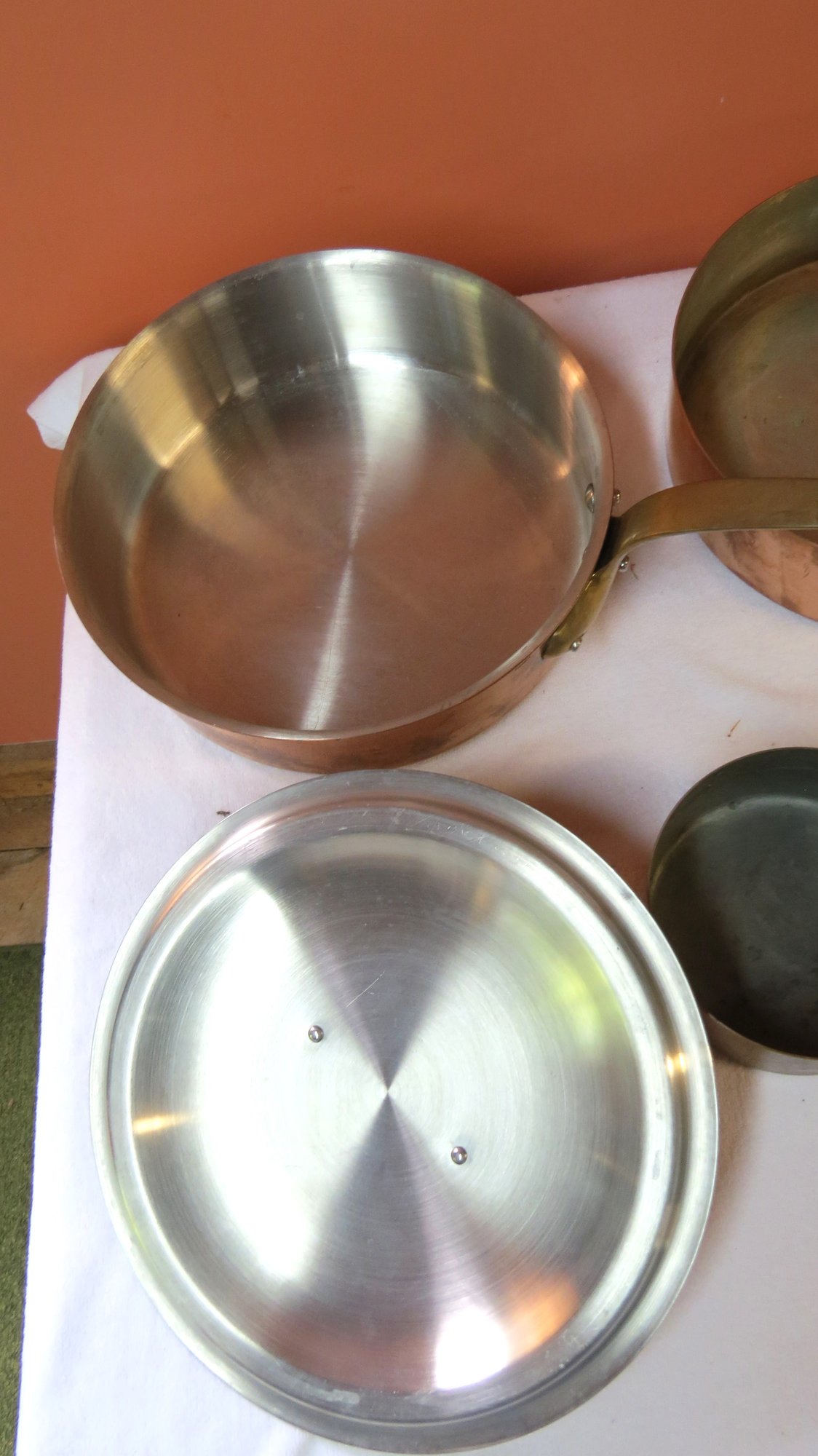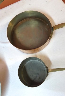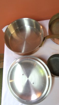 Lot 3 copper and brass French pans, one with lid, 10” x 3” , 8 ½” x 2 ½” and 5” x 2 ½”