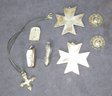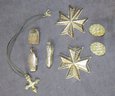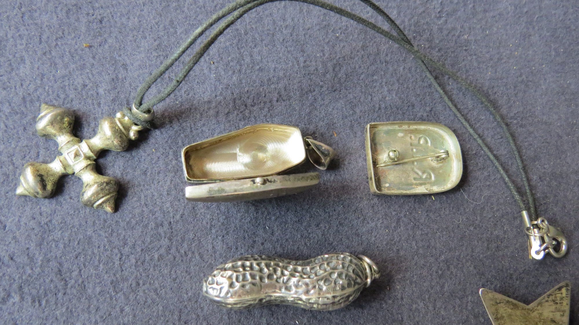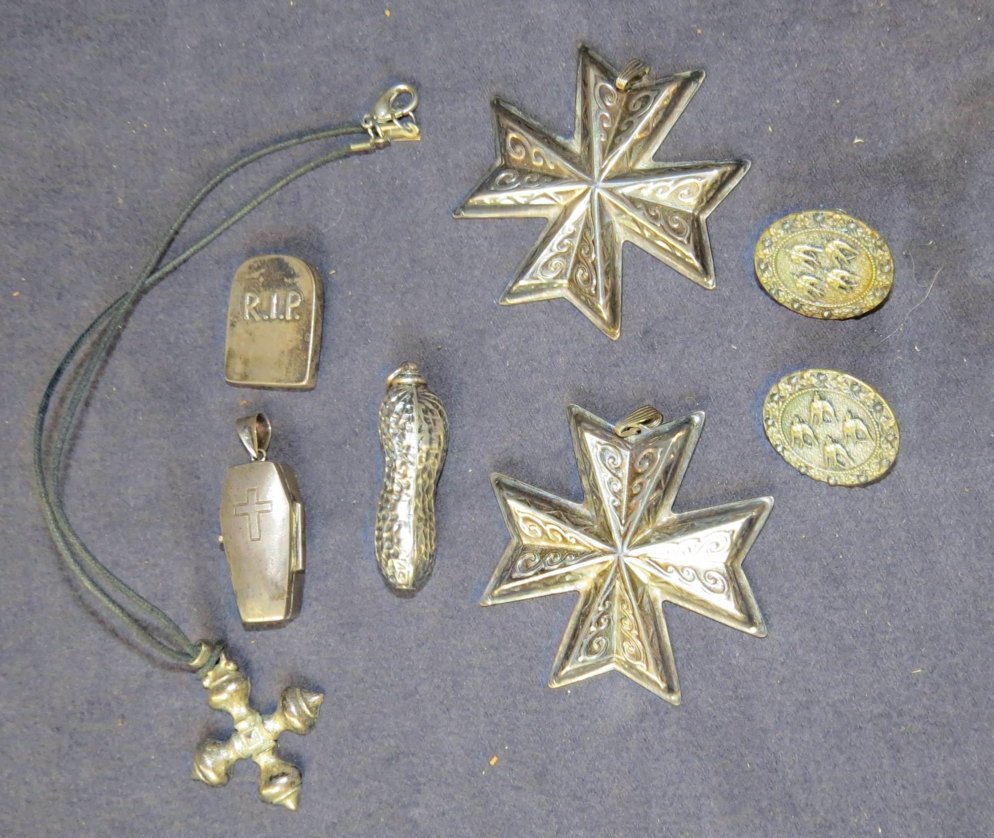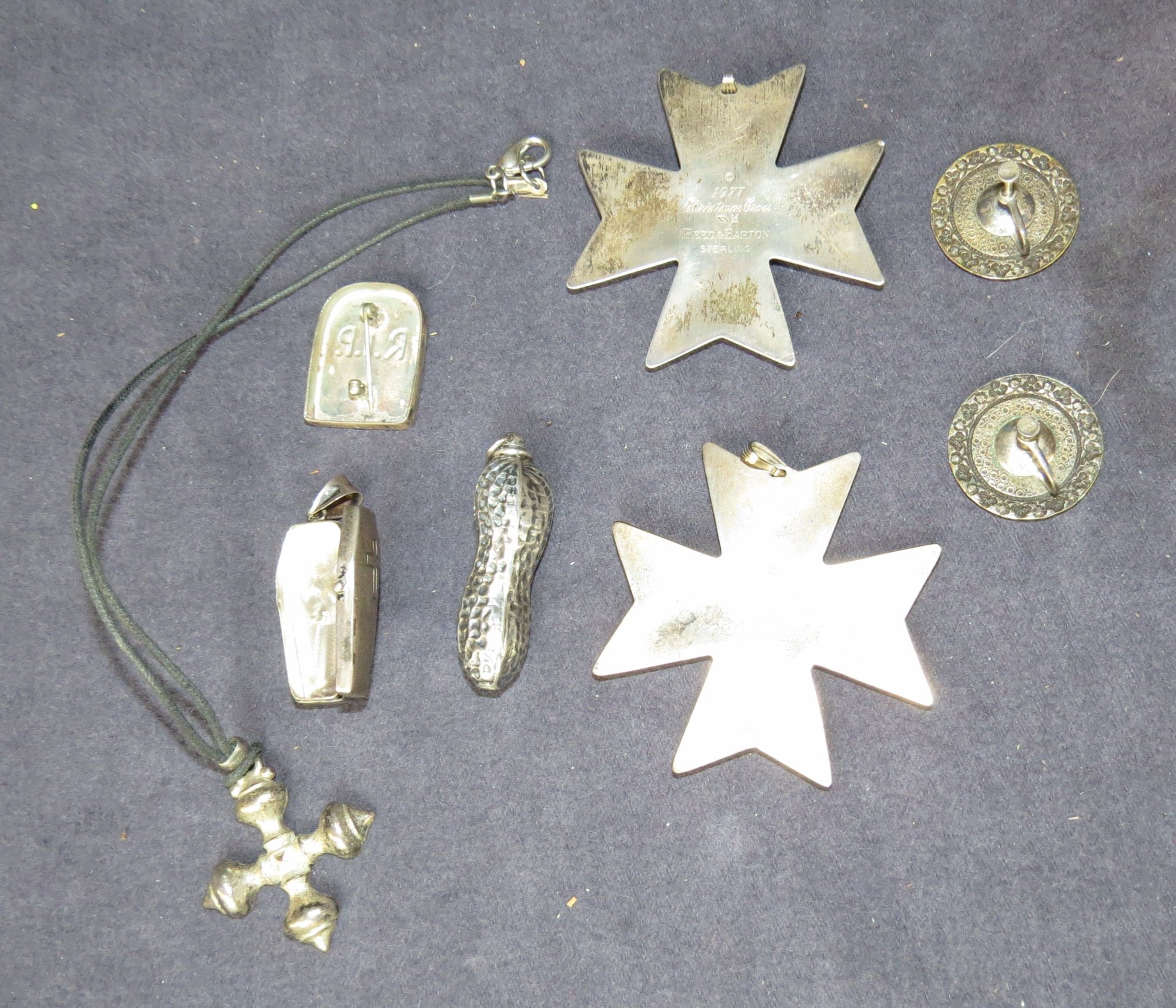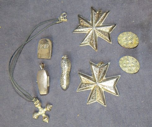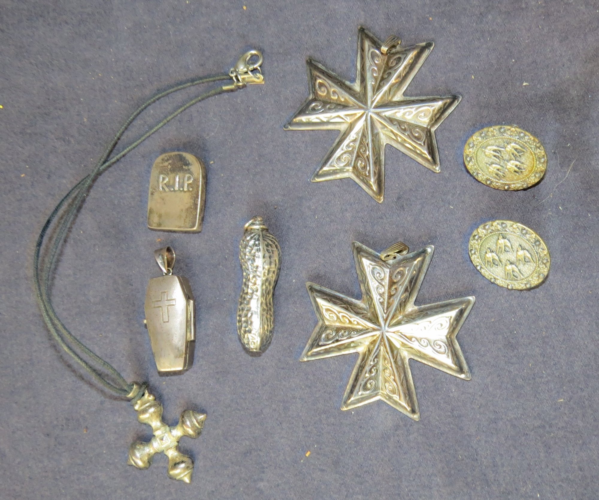 Lot sterling jewelry includes R.I.P pendant, casket pendant opens up, cross, peanut, Christmas crosses, ear rings, 52 dwt not including string