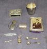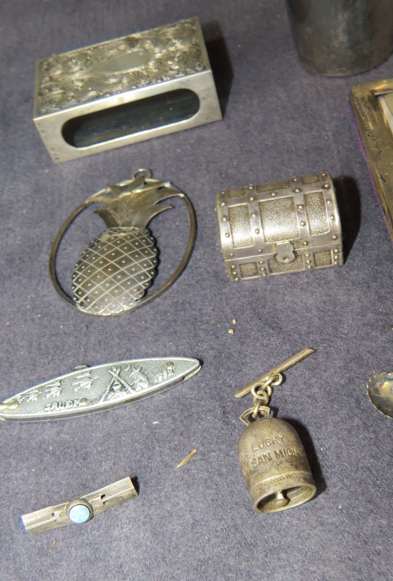 Lot sterling smalls includes match box holder, pineapple pendant, Salem pocket knife, mini trunk with working lid, small cup, dresser frame, salt spoons etc. 59.23 dwt not including knife or frame.