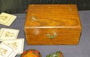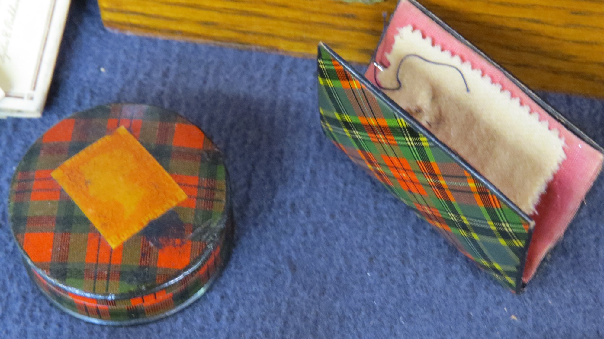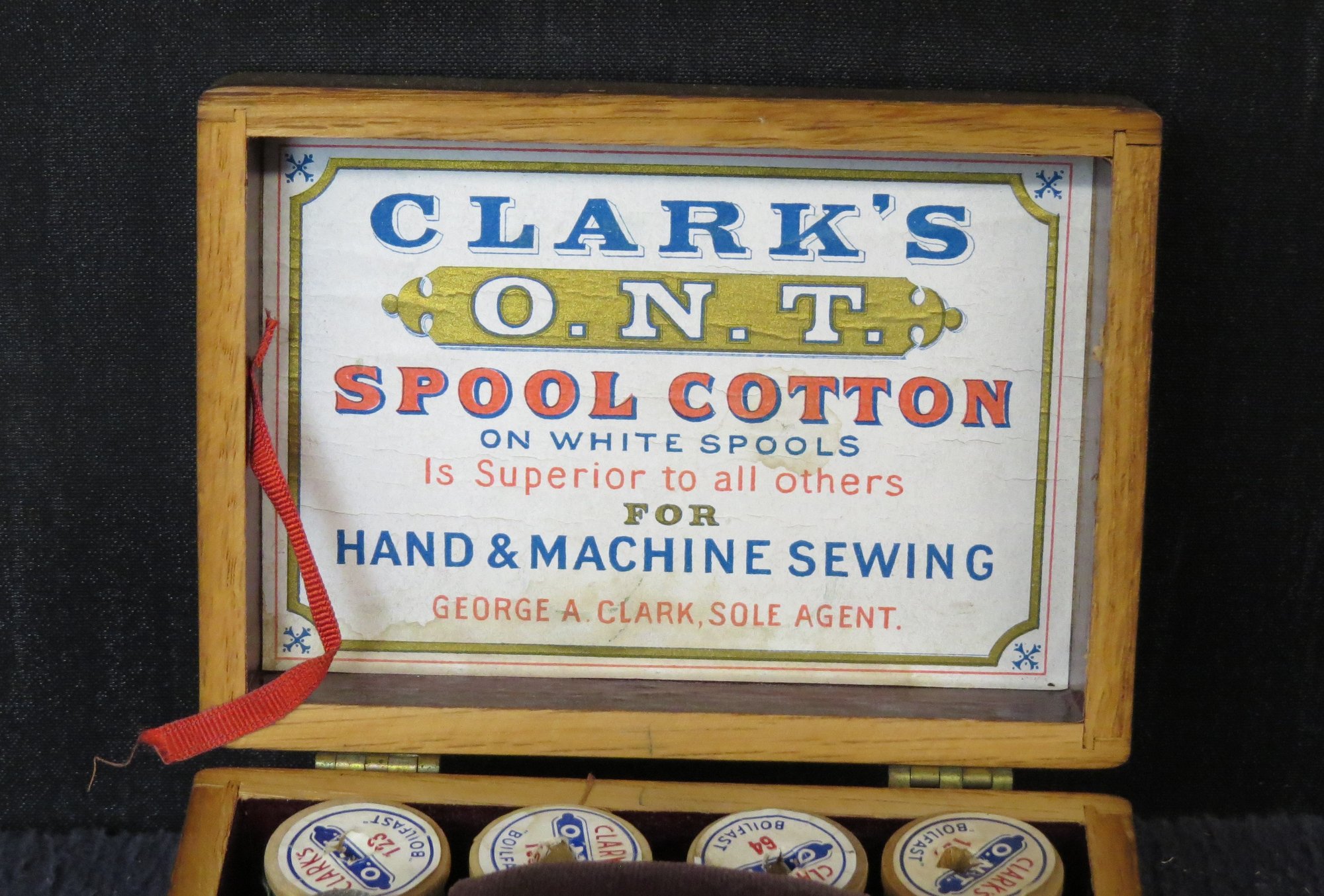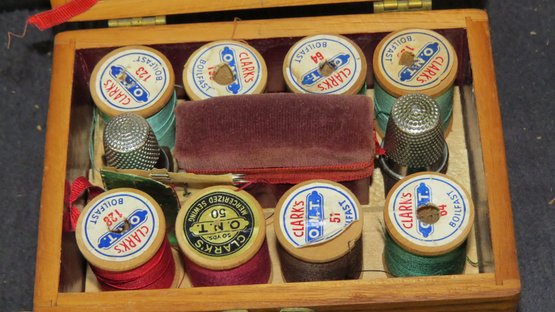 Lot sewing Implements, small oak box with spools of thread and needles,