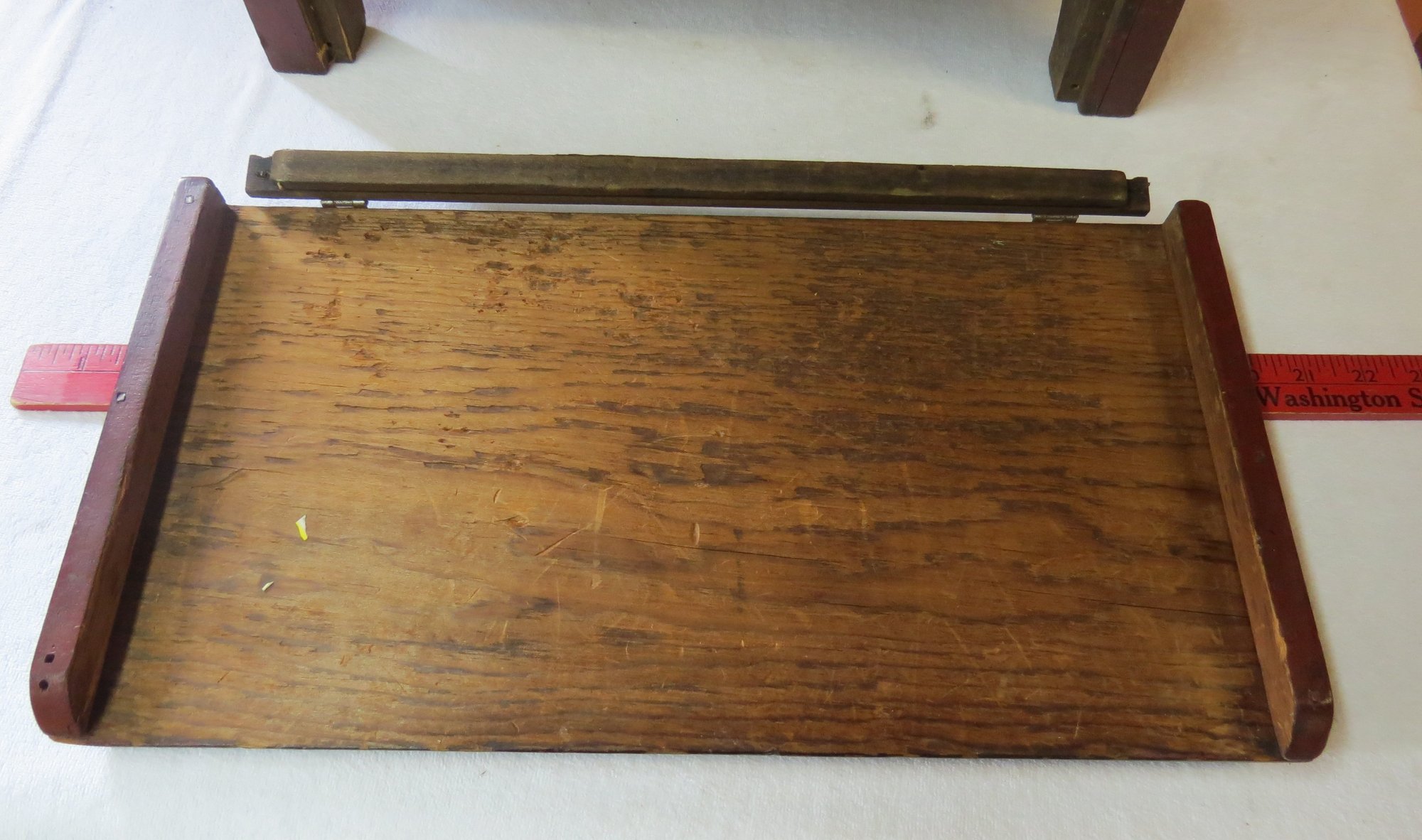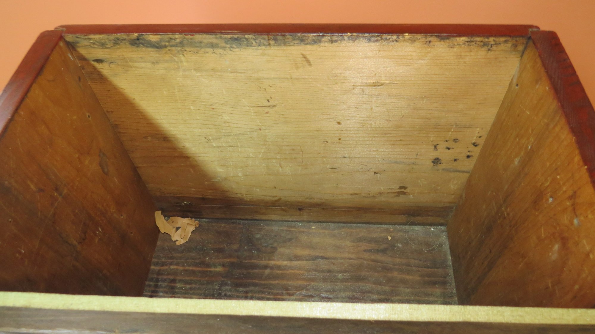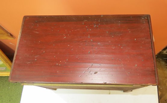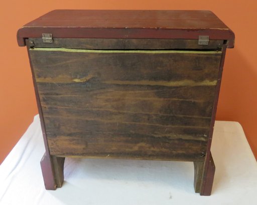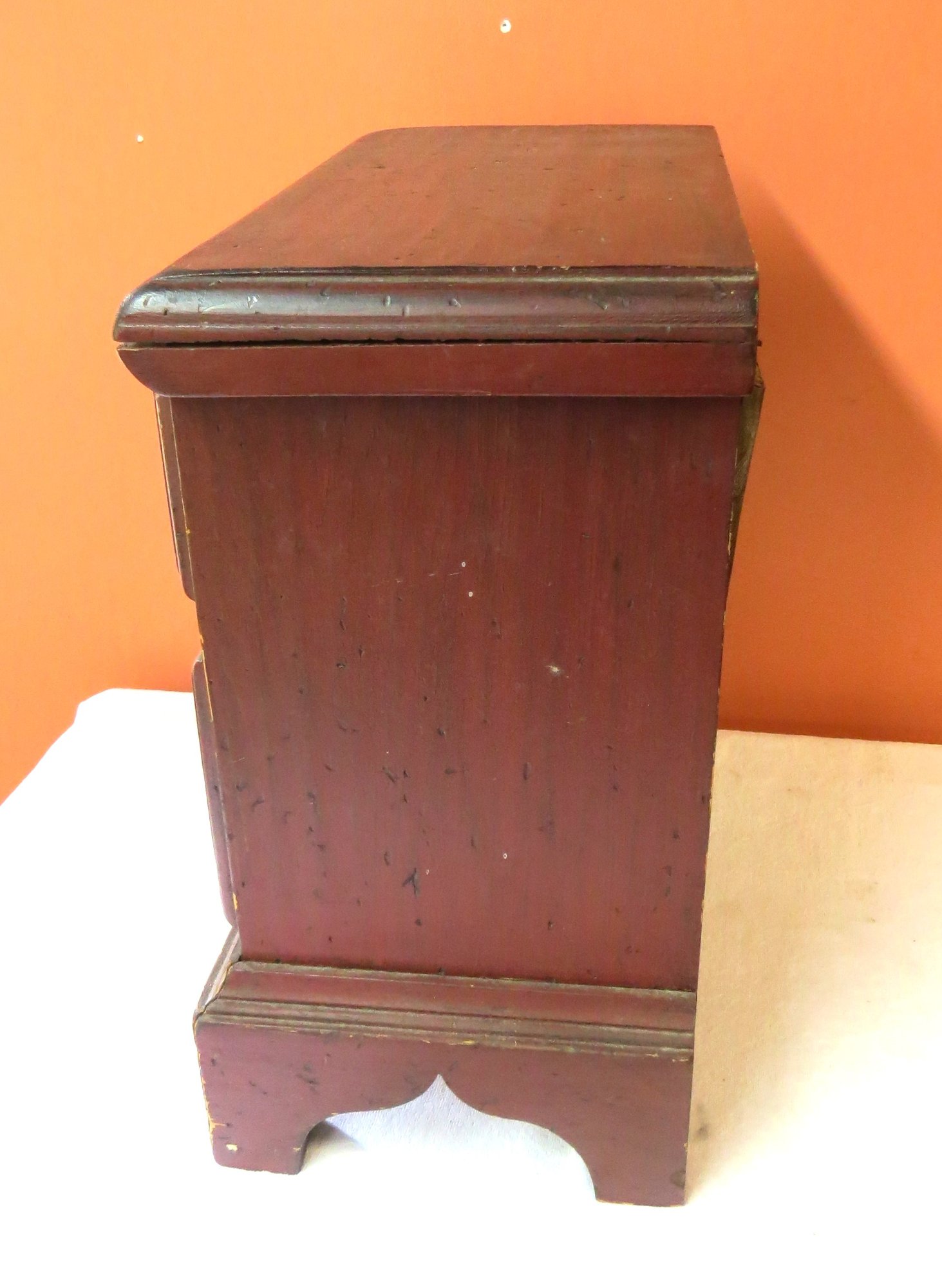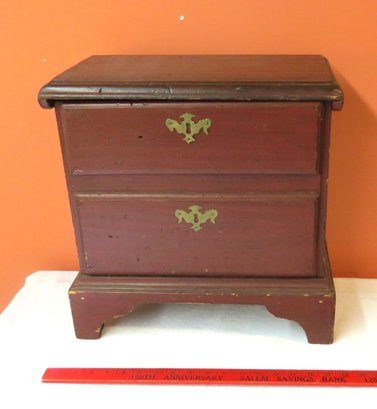 Notes: Miniature blanket chest in red paint with extensive restoration. 15 ½” w. x 8” d. x 17” h.