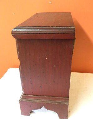 Miniature blanket chest in red paint with extensive restoration. 15 ½” w. x 8” d. x 17” h.