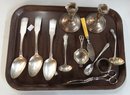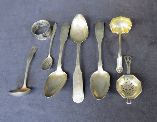 Lot of odd sterling pieces include napkin rings, 2 ladles, tea strainer and 3 coin silver table spoons, non-silver tongs and bone handle knife, did not weigh the weighted sticks, tongs or knife with bone handle, the remainder weighs 157 dwt