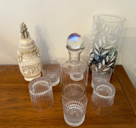 Misc Lot With Decanter - Whiskey Glasses And Asian Style Bottle With Lid