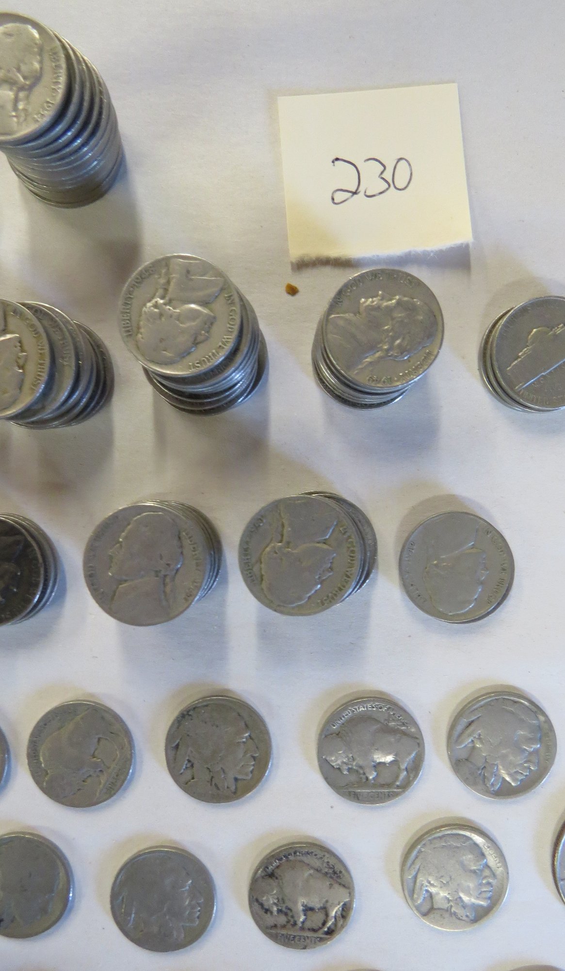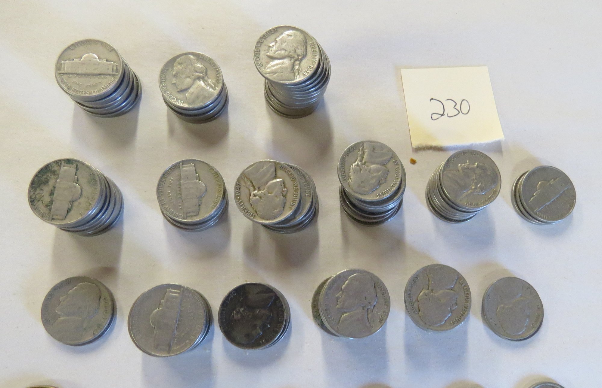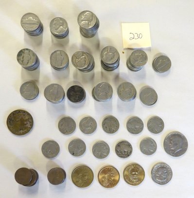 Lot contains: 1914-D half dollar worn condition, two 1939 Jefferson nickels, nineteen 1941 Jefferson nickels, two 1942 nickels, seventeen 1946 nickels, fourteen 1954, seven 1953, nine 1952 nickels, three 1951 nickels, seven 1949 nickels, ten 1948, nine 1947, seventeen 1946, fourteen 1940, ten buffalo nickels, one bicentennial Kennedy half, one Susan B. Anthony dollar, two Sacagawea dollars, one Ulysses Grant dollar, eighteen wheat pennies. Condition to be determined by the buyer